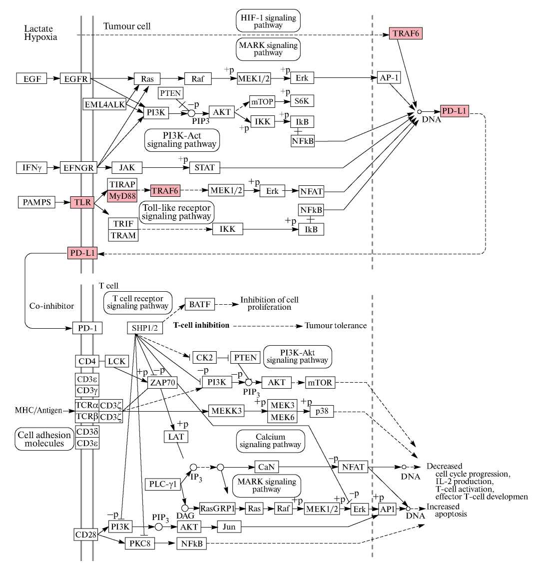 Рис. 3. Сигнальный путь экспрессии PD-L1 и контрольных точек PD-1, включая валидированные гены-мишени микроРНК-146а и микроРНК-424 (выделены красным цветом), согласно базе данных KEGG.