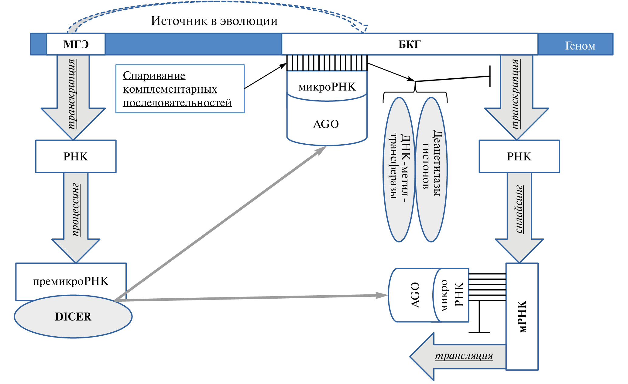 Рис. 1. Схема роли МГЭ в эпигенетическом контроле произошедших от них генов. БКГ – белок-кодирующий ген; МГЭ – мобильный генетический элемент.