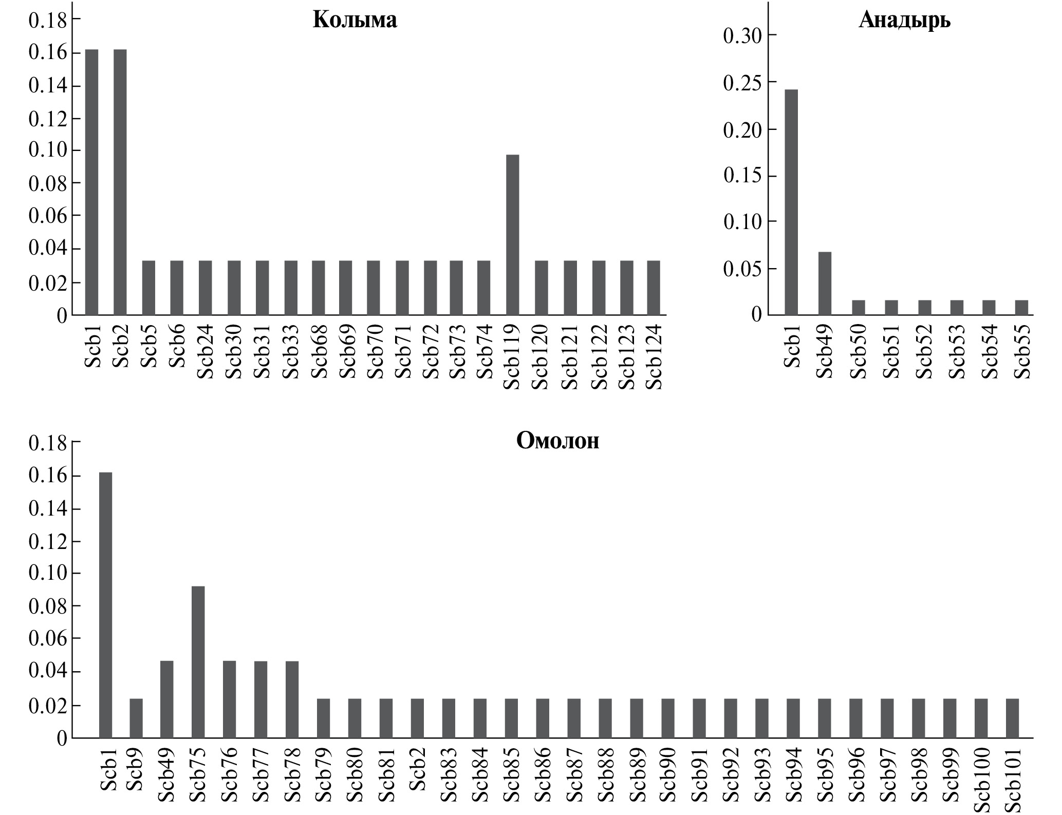 На рис. 3 показаны доли cytb-гаплотипов в выборках из исследованных популяций S. c. koreni. Вариант Scb1, определенный как предковый и превалирующий в изученной ранее популяции S. c. macropygmaeus Северного Приохотья [17], наиболее распространен и в выборках S. c. koreni. Кроме того, у особей обоих подвидов найдены Scb2 (носители отловлены в бас. рек Кулу, Среднекан и оз. Момонтай), Scb5 (бас. р. Среднекан), Scb6 (р-н оз. Урультун), Scb24 (бас. р. Кулу) и Scb9 (бас. р. Омолон, Чукотка) (рис. 3). Остальные гаплотипы обнаружены у особей S. c. koreni и специфичны для каждой исследованной выборки. Исключение составляет Scb49, выявленный у бурозубок бас. р. Омолон и г. Анадырь. Количество найденных гаплотипов cytb (n) и вариабельных сайтов (V) в каждой из групп пропорциональны размеру выборок (N) (табл. 1). Основная часть вариантов cytb во всех выборках представлена единичными экземплярами (рис. 3). Значительный уровень полиморфизма нуклеотидных последовательностей cytb-вариантов определяет высокие значения индексов молекулярного разнообразия (табл. 1), что указывает на стабильность популяций, имеющих в течение длительного времени высокое значение эффективной численности [28]. Нуклеотидное разнообразие (π) и среднее число попарных различий между гаплотипами (Pi) – оказались выше у бурозубок бас. верховьев Колымы, гаплотипическое разнообразие (h) выше в выборке из бас. р. Омолон. Наименьшие значения всех индексов – в группе бурозубок из окрестностей г. Анадырь – могут быть связаны с небольшим числом исследованных особей.