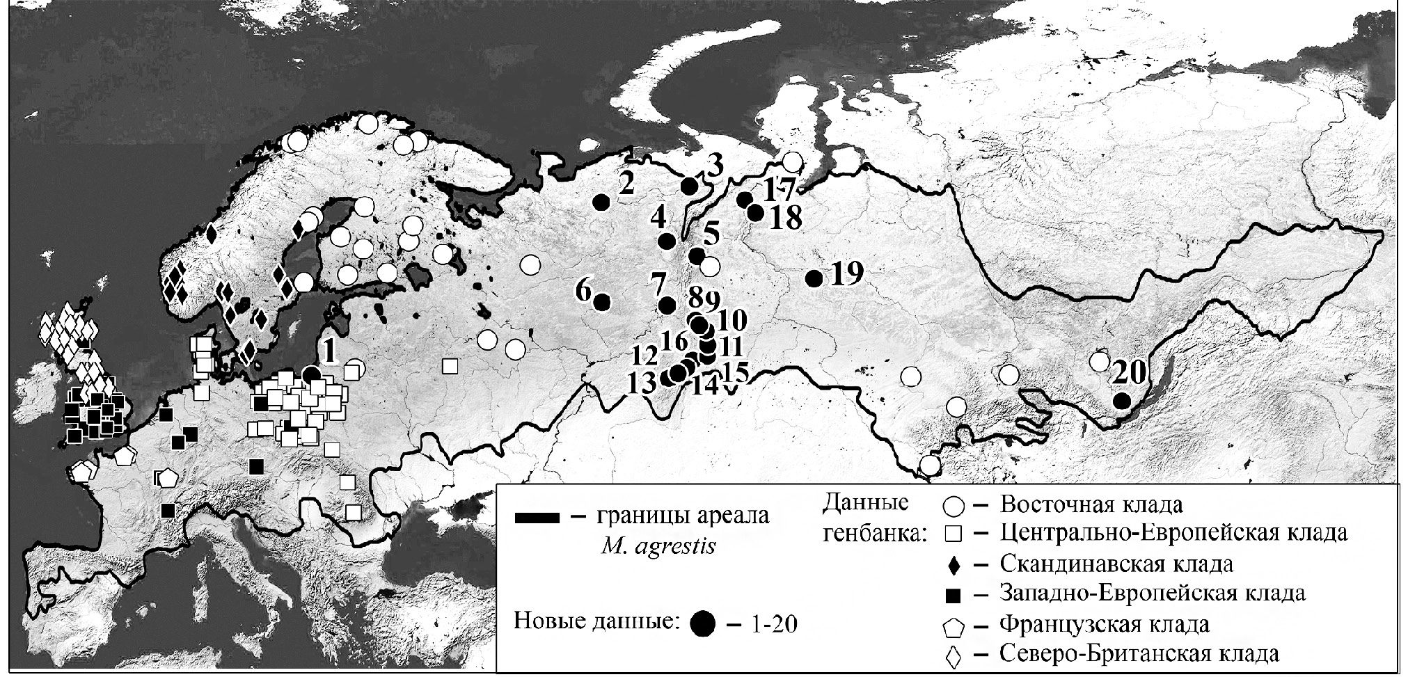 Рис. 1. Ареал M. agrestis [3], точки сбора нового материала и географическая локализация данных базы GenBank, анализируемых в работе