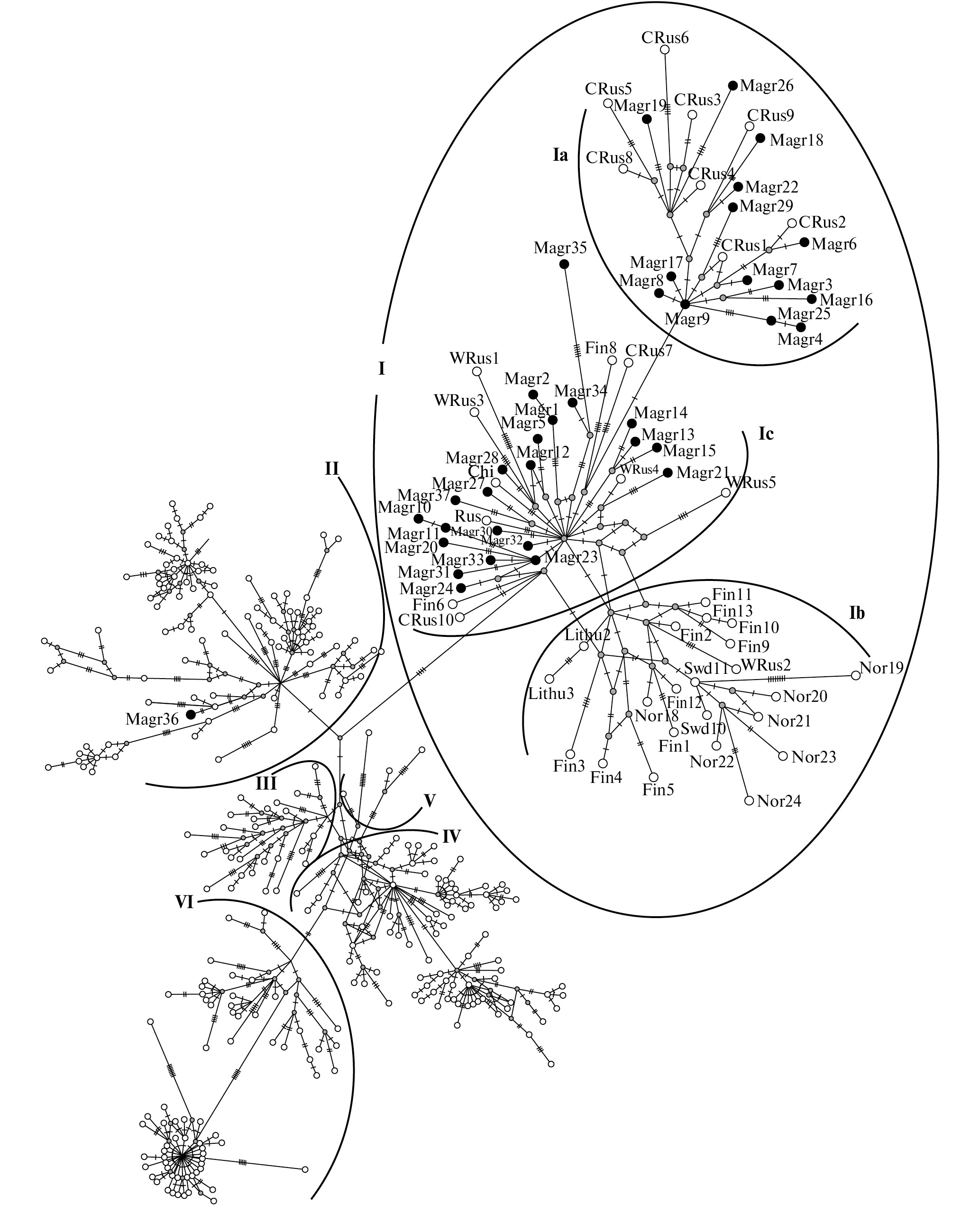 Рис. 3. Медианная сеть 348 гаплотипов cytb (1140 пн) M. agrestis. I–VI клады: I – Восточная, II – Центрально-Европейская, III – Скандинавская, IV – Западно-Европейская, V – Французская, VI – Северо–Британская. Ia–Ic – гаплогруппы Восточной клады. Черные круги – оригинальные гаплотипы (Magr1–Magr37)