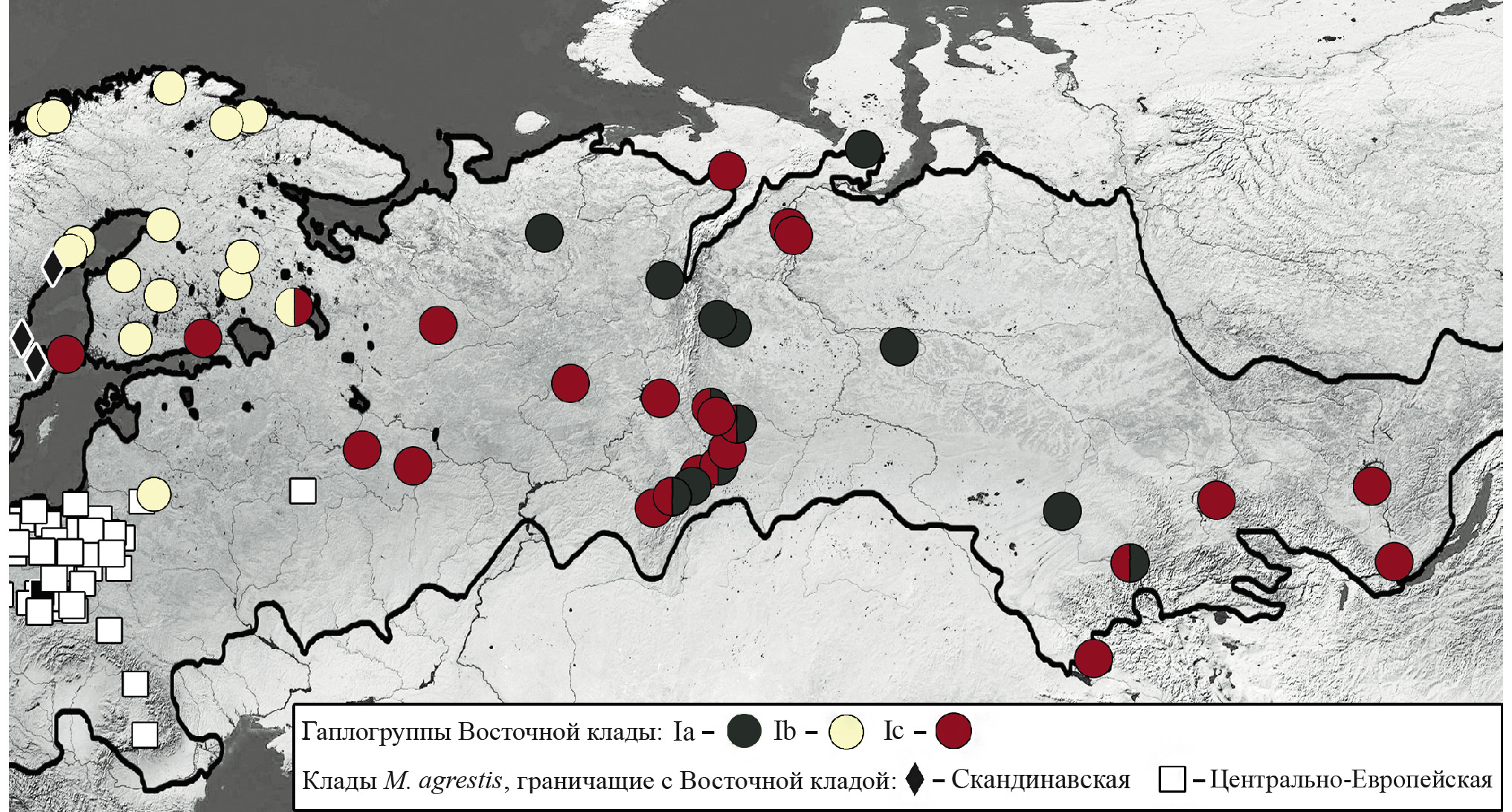 Рис. 4. Географическое положение гаплогрупп Восточной клады M. agrestis