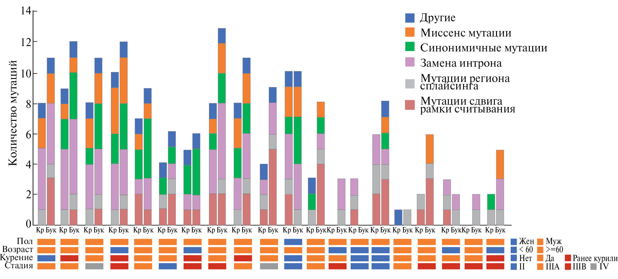 Рис. 3. Количество различных типов мутаций у пациентов с раком легкого в буккальном эпителии и крови