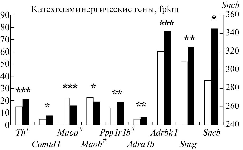 Рис. 1. Экспрессия ДЭГ катехоламинергических систем в ГПТ у депрессивных самцов мышей. Белые столбцы – контроль, темные столбцы – депрессивные мыши. * p < 0.05, ** p < 0.01, *** p < 0.001 vs. контроль. Для гена Sncb представлена вспомогательная шкала. Данные выражены в единицах FPKM. # – ранее опубликованные данные [21].