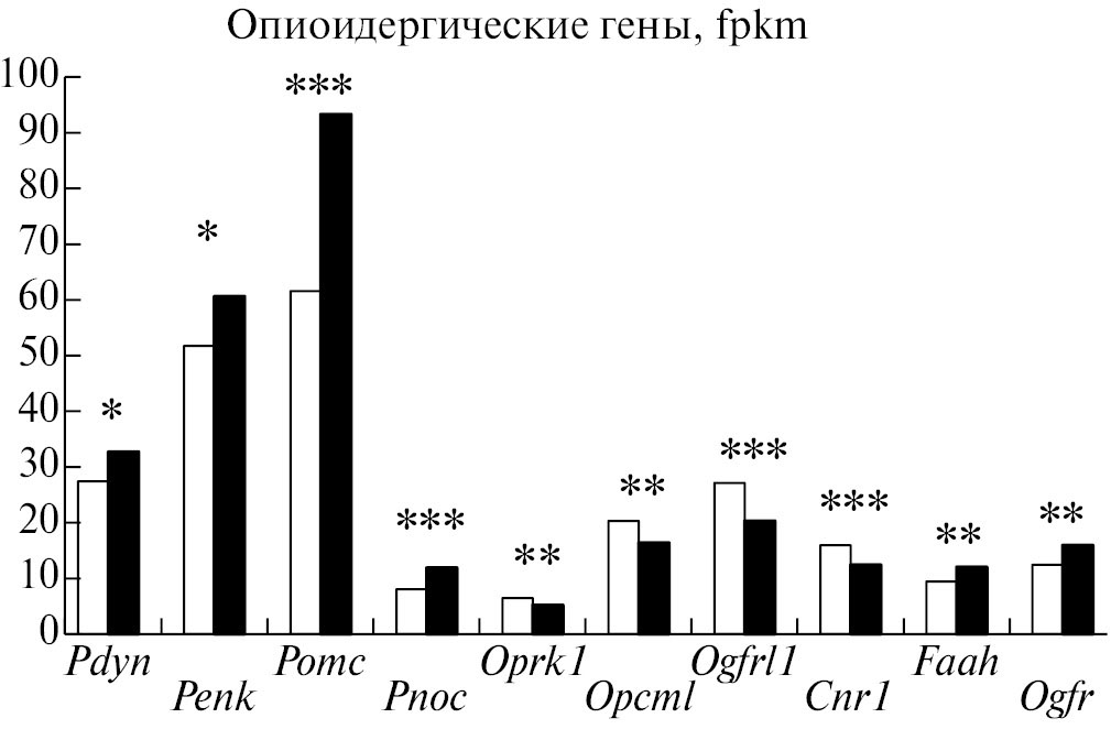 Рис. 2. Экспрессия ДЭГ опиоидергических и каннабиноидной систем в ГПТ у депрессивных самцов мышей. Белые столбцы – контроль, темные столбцы – депрессивные мыши. *p < 0.05, ** p < 0.01, *** p < 0.001 vs. контроль. Данные выражены в единицах FPKM.