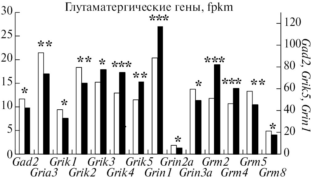 Рис. 3. Экспрессия ДЭГ глутаматергической системы в ГПТ у депрессивных самцов мышей. Белые столбцы – контроль, темные столбцы – депрессивные мыши. *p < 0.05, **p < 0.01, ***p < 0.001 vs. контроль. Для генов Gad2, Grik5, Grin1 представлена вспомогательная шкала. Данные выражены в единицах FPKM.
