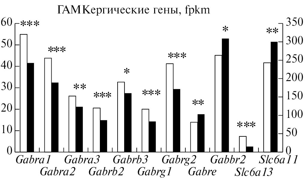 Рис. 4. Экспрессия ДЭГ ГАМКергической системы в ГПТ у депрессивных самцов мышей. Белые столбцы – контроль, темные столбцы – депрессивные мыши. *p < 0.05, **p < 0.01, ***p < 0.001 vs. контроль. Для гена Slc6a11 представлена вспомогательная шкала. Данные выражены в единицах FPKM.