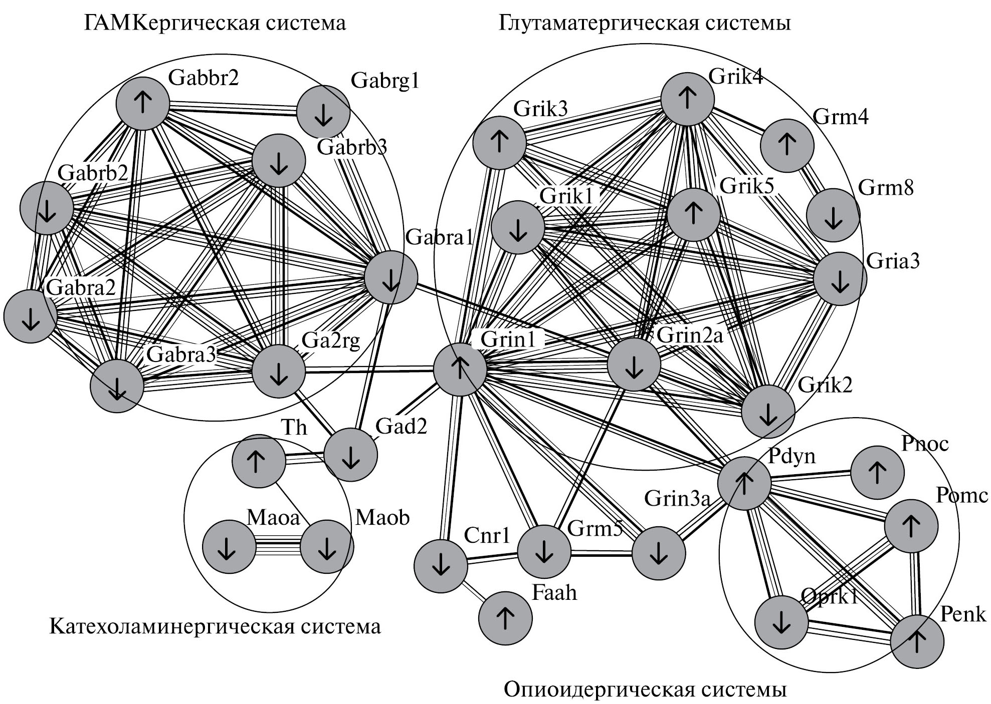 При рассмотрении на рис. 5 каждой из нейротрансмиттерных систем (системы обведены овалами: катехоламинергические, опиоидергические, глутаматергическая и ГАМКергическая) можно отметить, что наибольшее число взаимосвязей установлено между продуктами генов, относящимися к одной медиаторной системе, и выделить основной связующий ген, на который замыкается наибольшее число генов в одной системе.