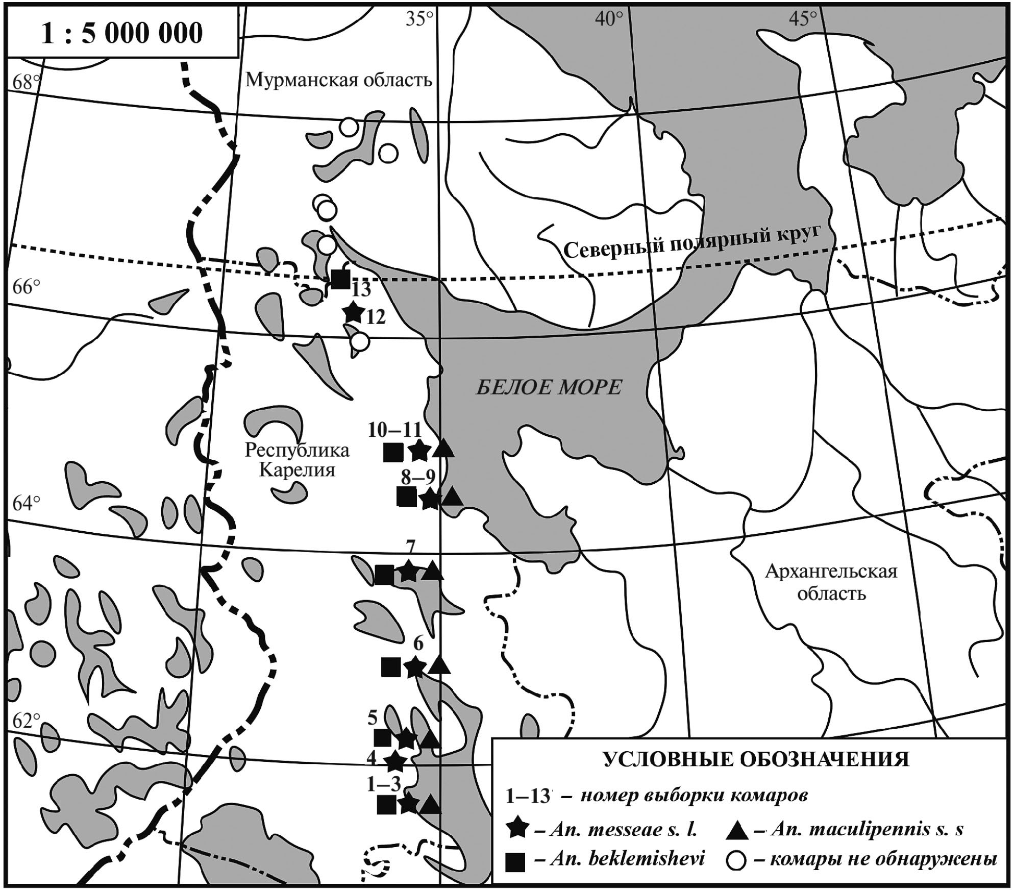 В июле 2022 г. нами были обследованы водоемы в Мурманской области, расположенные к северу от полярного круга: в окрестностях г. Кандалакша – озеро у губы Лупче (67.159583, 32.375519), пруд в районе губы Лупче (67.162094, 32.374103), р. Нива (67.147768, 32.424096), пруд у р. Нива (67.147184, 32.428109), болото у р. Нива (67.146078, 32.426983); озеро в окрестностях пгт Зеленоборский (66.866782, 32.390384); озеро в окрестностях с. Княжья губа (66.869059, 32.399852); пруды в г. Мончегорске (67.941813, 32.896272; 67.947667, 32.874325); заболоченность в окрестностях г. Кировска (67.648564, 33.702231). Во всех этих биотопах личинки и куколки малярийных комаров не обнаружены, а также не было прилетов имаго комаров комплекса Maculipennis. Согласно нашим данным, в северной таежной подзоне Заполярья (Кандалакша, Зеленоборский, Княжья губа, Кировск) и в арктической лесотундре (Мончегорск) комары рода Anopheles не обитают.