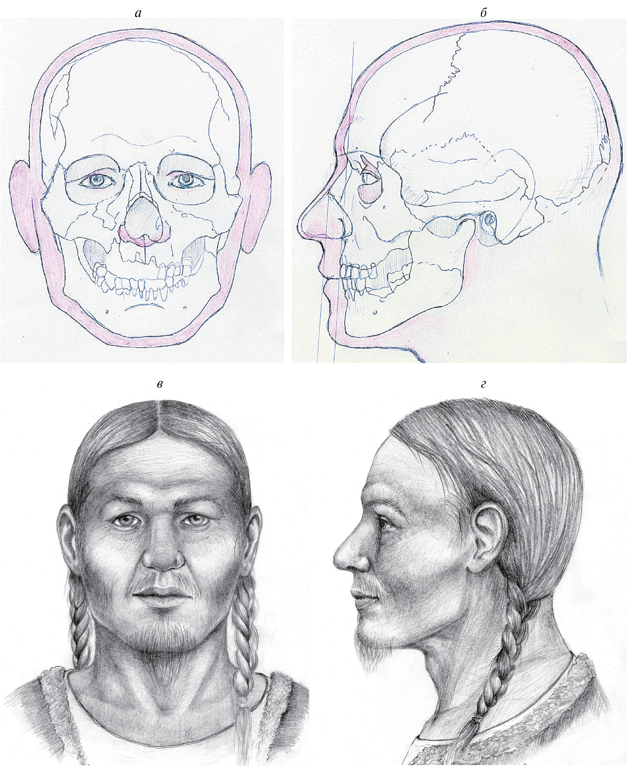 Рис. 1. Реконструкция облика по черепу индивида № 93 из Тольёнского могильника. Авторы Е.В. Веселовская, О.Э. Валеева. а – контурная реконструкция, фас; б – контурная реконструкция, профиль; в – графический портрет, фас; г – графический портрет, профиль.