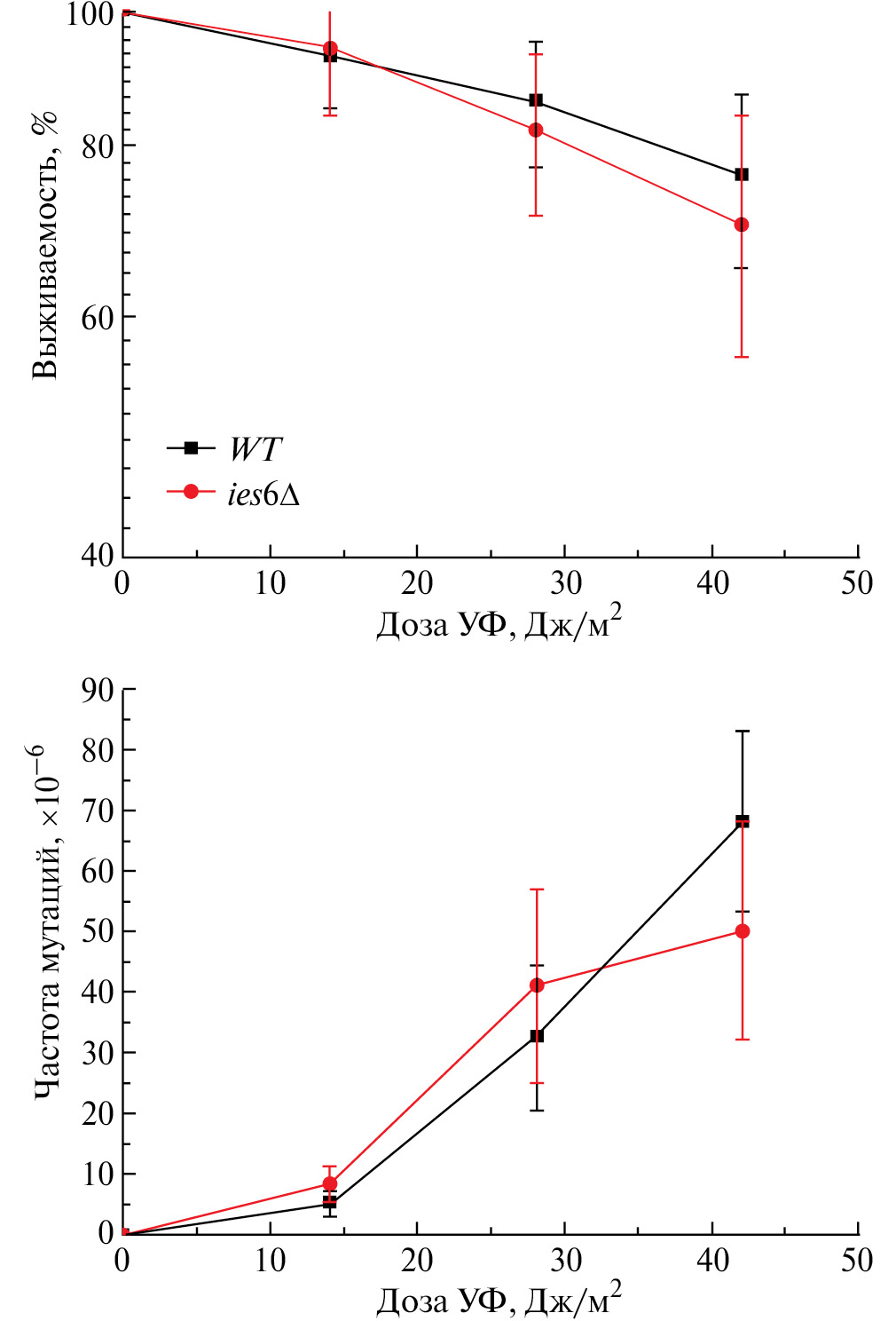 Рис. 1. Чувствительность к УФ-свету и частота УФ-индуцированного мутагенеза в локусе CAN1 у штамма дикого типа и мутантного диплоидного штамма ies6Δ при обработке различными дозами ультрафиолетового излучения. На графиках показаны стандартные ошибки среднего значения (± SEM), полученные в результате пяти независимых экспериментов.