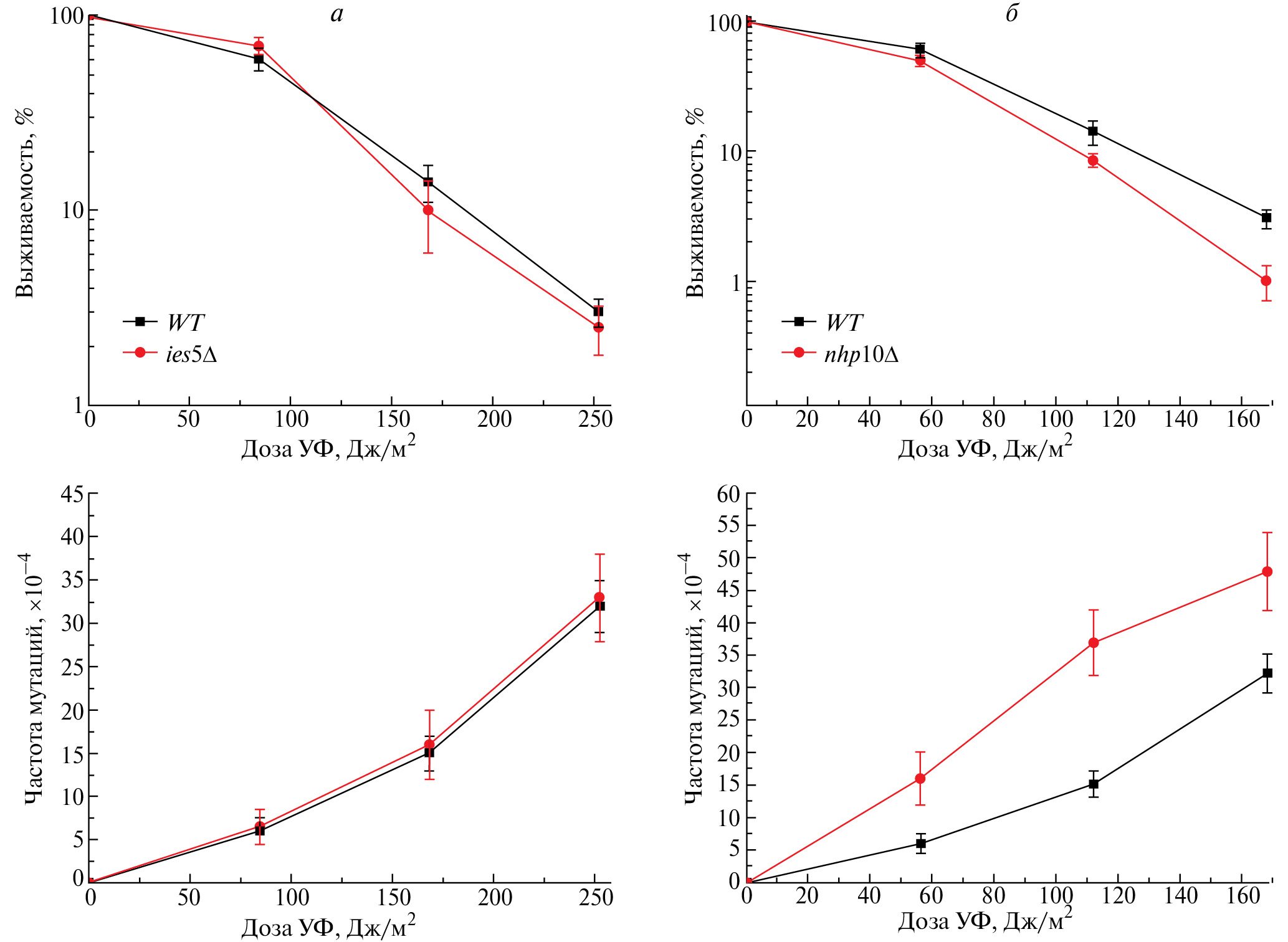 Рис. 2. Чувствительность к УФ-свету и частота УФ-индуцированного мутагенеза в локусах ADE4–ADE8 у штамма дикого типа и мутантного штамма ies5Δ (а) и мутантного штамма nhp10Δ (б) при обработке различными дозами ультрафиолетового излучения.