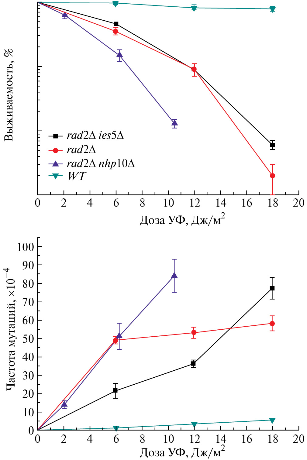 Для оценки влияния мутаций ies5Δ и nhp10Δ на УФ-индуцированный мутагенез мы измерили частоту прямых мутаций в локусах ADE4–ADE8, индуцированных УФ-лучами у штамма дикого типа и одиночных мутантов ies5Δ и nhp10Δ. Данные, представленные на рис. 2,б, позволяют предположить, что мутация ies5Δ не влияет на частоту УФ-индуцированного мутагенеза. Частота УФ-индуцированного мутагенеза у двойного мутанта ies5Δ rad2Δ практически не отличалась от одиночного rad2Δ (рис. 3). В отличие от ies5Δ мутант nhp10Δ усиливал УФ-индуцированный мутагенез по сравнению со штаммом дикого типа (рис. 2,б). Двойной мутант nhp10Δ rad2Δ проявлял гиперчувствительность по сравнению с одиночным мутантом. Это взаимодействие было аддитивным, что указывает на разницу в механизмах чувствительности к УФ-излучению, опосредованную мутациями nhp10Δ и rad2Δ (рис. 3). Однако при равной выживаемости частота мутаций у мутанта nhp10Δ и штамма дикого типа была одинаковой. Такая же картина наблюдалась для мутантов rad2Δ и nhp10Δ rad2Δ.