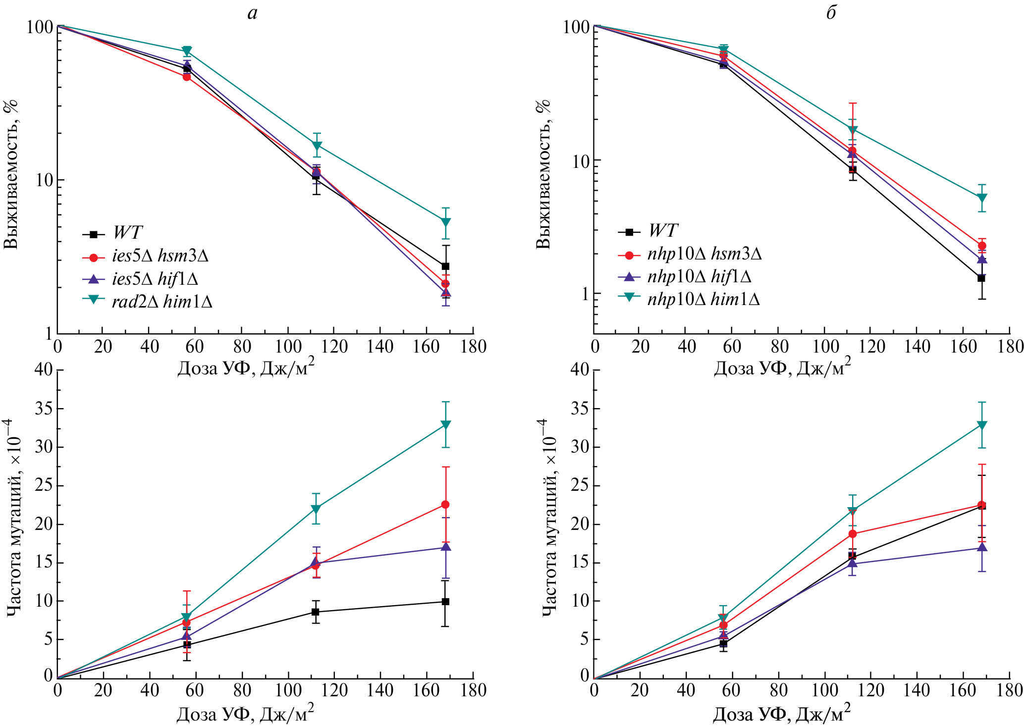 Рис. 4. Чувствительность к УФ-свету и частота УФ-индуцированного мутагенеза в локусах ADE4–ADE8 у штамма дикого типа и мутантных штаммов ies5Δ hsm3Δ, ies5Δ hif1Δ и ies5Δ him1Δ (а) и nhp10Δ hsm3Δ, nhp10Δ hif1Δ и nhp10Δ him1Δ (б) при обработке различными дозами ультрафиолетового излучения.