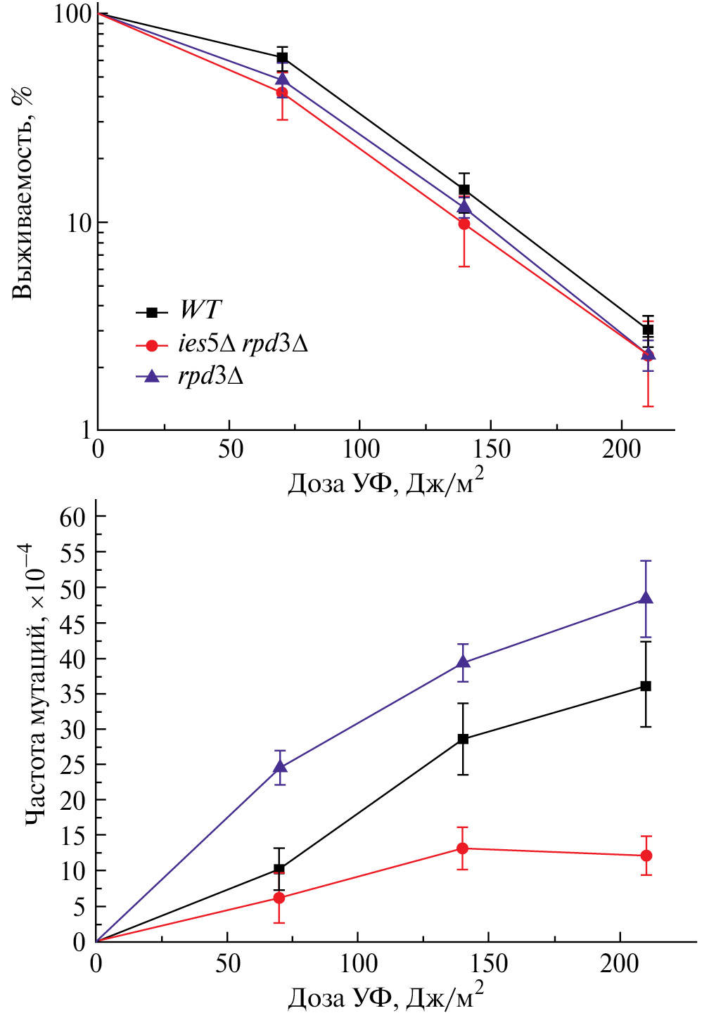 Тесты на выживаемость клеток проводили путем выращивания в течение ночи культуры соответствующего штамма в жидкой YPD при 30 °C. Клетки промывали и ресуспендировали в воде с плотностью 1 × 107 кл./мл. Суспензию клеток облучали УФ-лампой БУВ-30 (диапазон УФ-С) с мощностью дозы на верхнем уровне 1.4 Дж/м2с (для штаммов дикого типа, ies5Δ, nhp10Δ, ies6Δ, rpd3Δ, ies5Δ rpd3Δ, ies5Δ him1Δ, ies5Δ hsm3Δ, ies5Δ hif1Δ, nhp10Δ him1Δ, nhp10Δ hsm3Δ и nhp10Δ hif1Δ) и на нижнем уровне – 0.21 Дж/м2 с (для штаммов rad2Δ, rad2Δ ies5Δ и rad2Δ nhp10Δ). Аликвоты отбирали после различных доз облучения, разбавляли и помещали на чашки с YPD для определения количества выживших [5].