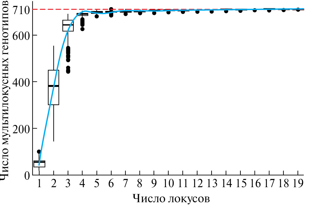 По результатам анализа минимального количества локусов, необходимых для дифференциации генотипов, максимальная информативность возможна уже при шести локусах и стабильно достигается (медиана уникальных генотипов = максимальному числу генотипов) при 17 локусах (рис. 1). По результатам анализа PIC используемые локусы показали средний уровень информативности – медиана значения PIC по всем локусам по общему набору данных составила 0.55, максимум 0.83 (локус vWf), минимум 0.23 (локус 2054).