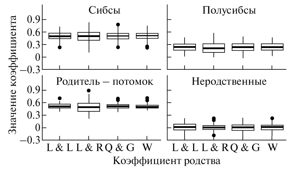 Рис. 2. Сравнение различных коэффициентов родства на основе 1000 симулированных родственных пар. Коэффициенты родства: L&L – Li; L&R – Lynch-Ritland; Q&G – Queller-Goodnight; W – Wang.