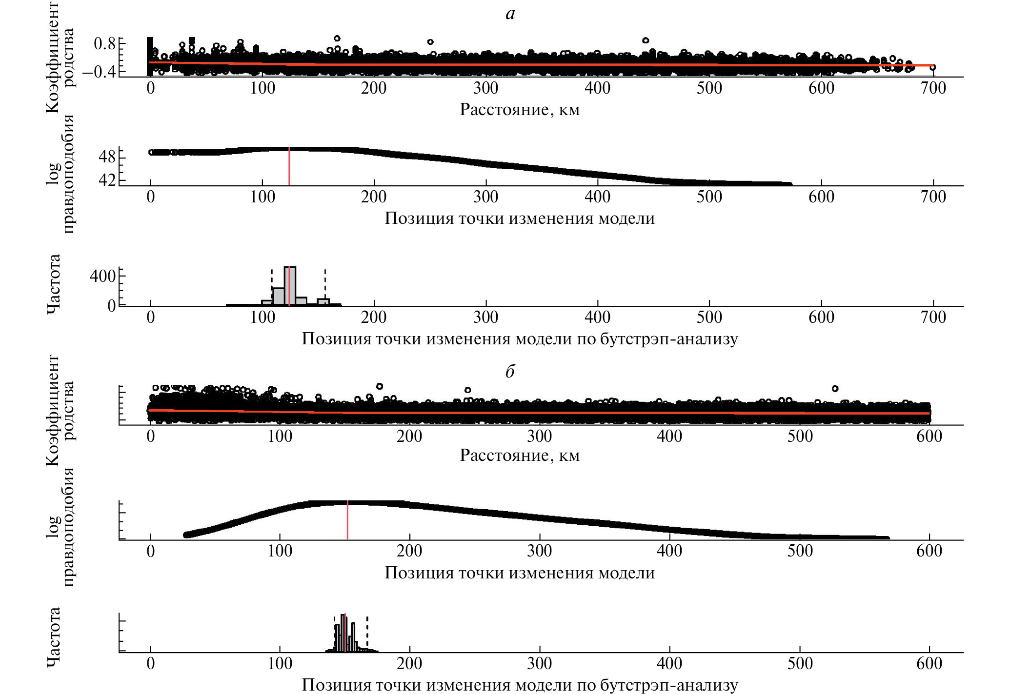 Рис. 3. График определения точки изменения линейной модели путем расчета по координатам без внесенного случайного шума (а) и с ним (б). Верхний график – зависимость индекса родства от расстояния в км; средний график – логарифм вероятности положения точки изменения модели; нижний график – результаты бутстрэп-анализа точки изменения модели.