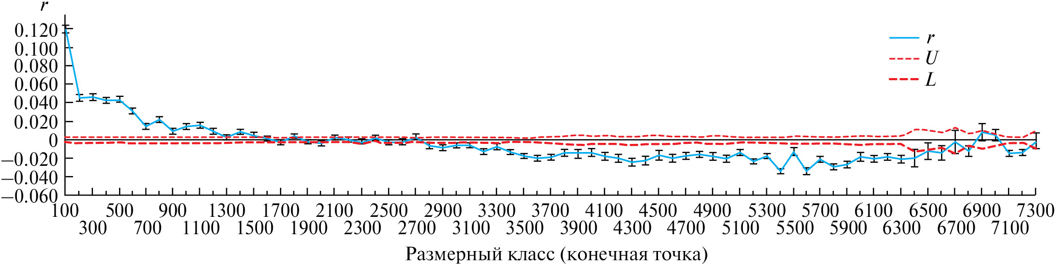 Рис. 4. Результаты анализа пространственной автокорреляции с использованием размерных классов в 200 км. r – индекс пространственной автокорреляции; U, L – верхний и нижний доверительные интервалы для отсутствия автокорреляции.