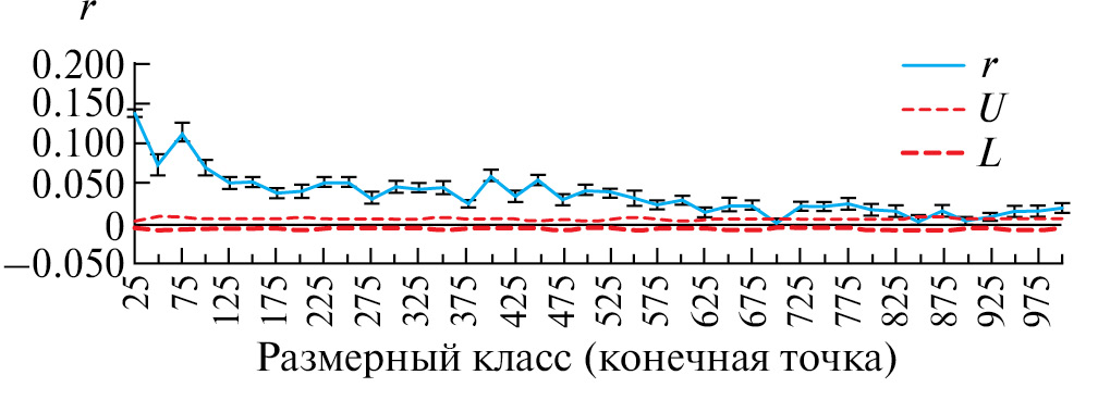 Рис. 5. Пространственная автокорреляция с использованием размерных классов в 25 км. r – индекс пространственной автокорреляции; U, L – верхний и нижний доверительные интервалы для отсутствия автокорреляции.