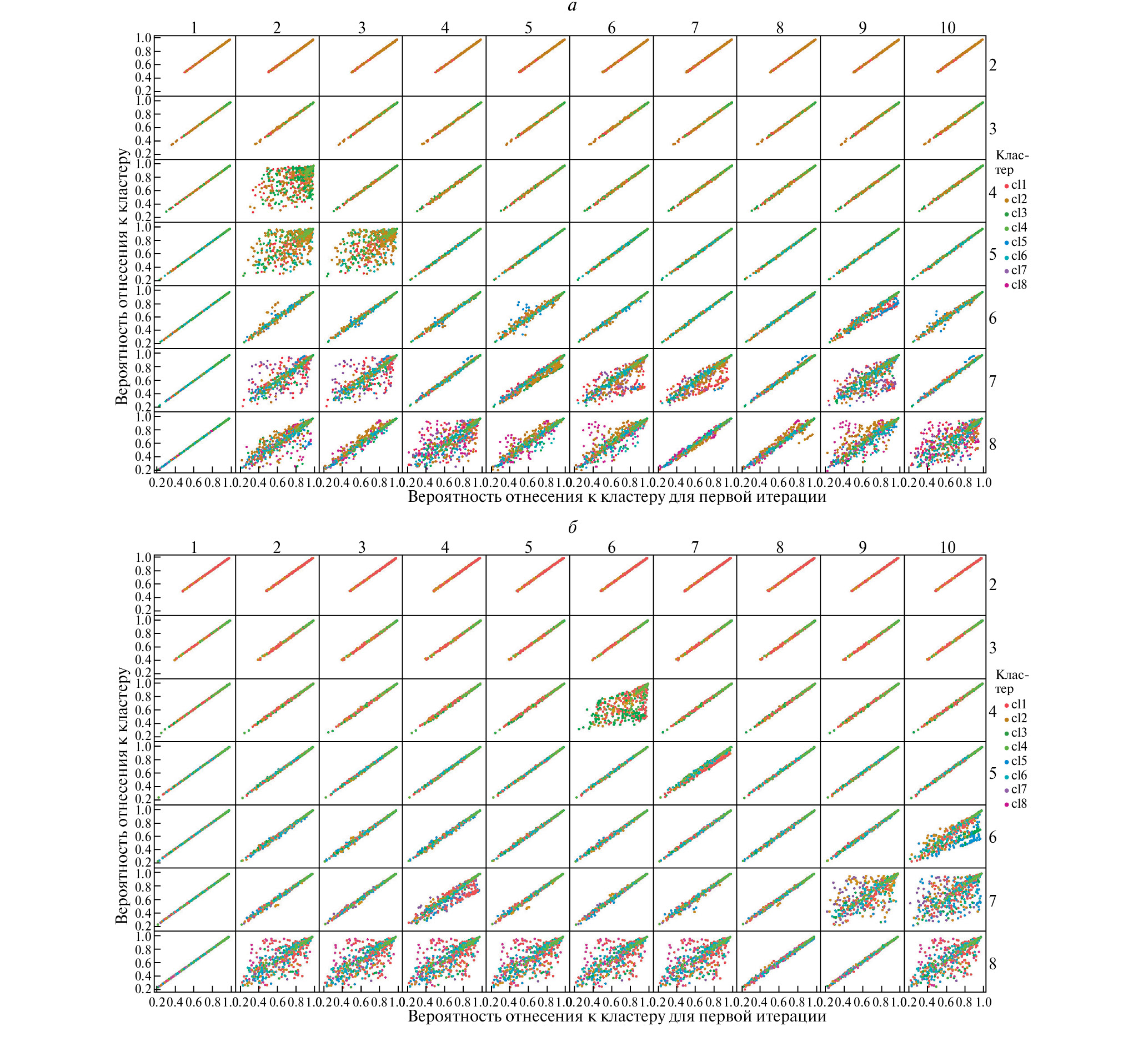 Рис. 7. График консенсуса между итерациями STRUCTURE для полного (а) и сокращенного (б) набора генотипов. В каждой ячейке по вертикали – вероятность отнесения особи к номинальному кластеру для данной итерации, по горизонтали – вероятность отнесения особи к номинальному кластеру для первой итерации. Организация ячеек по вертикали – значение K, по горизонтали – порядковый номер итерации STRUCTURE.