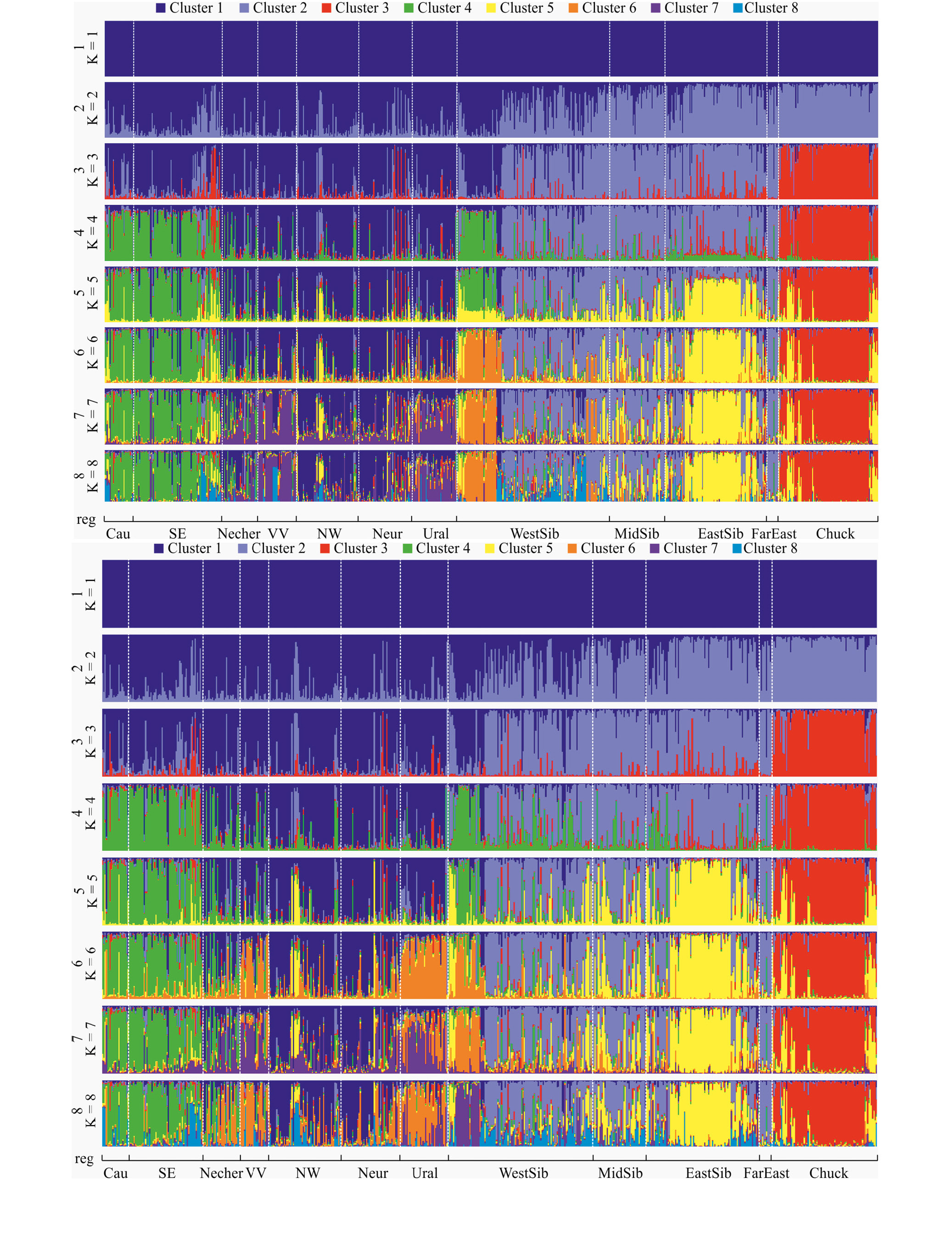 При анализе обоих наборов данных наибольшее значение ∆K наблюдалось для K = 2 (рис. 7), что соответствует разделению популяции на европейский и сибирский кластеры. Второе наибольшее значение ∆K наблюдалось для K = 3, при котором обособляется кластер, соответствующий популяции Чукотки. Начиная с K = 4 значения ∆K выходили на плато. При K = 4 в отдельный кластер выделялись популяции юга России, а также некоторые западносибирские популяции. При расчете ∆K без учета K = 1 максимальное значение наблюдалось для K = 3.