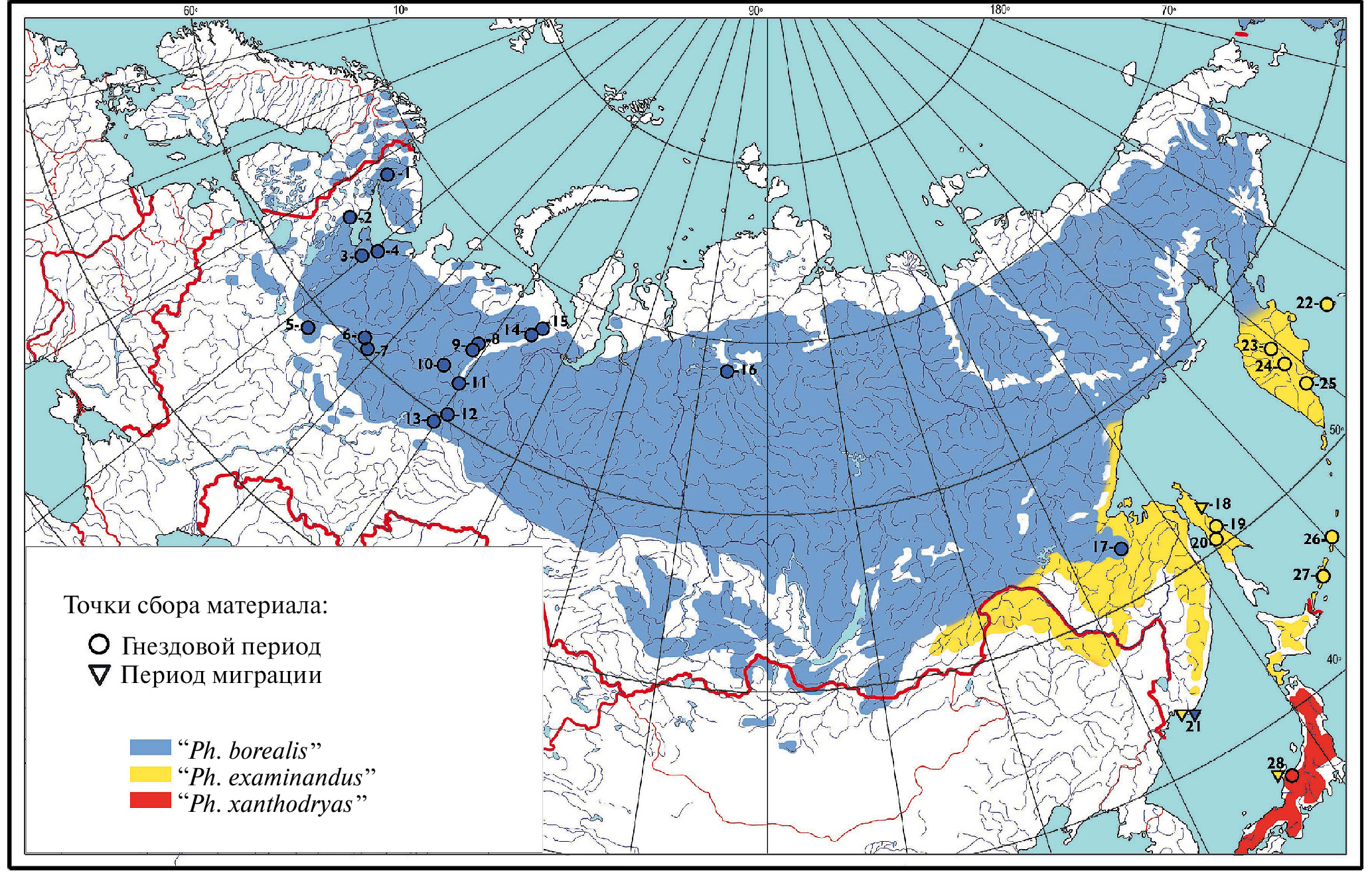 В дальнейшем изложении для упрощения наименования трех таксономических группировок комплекса мы будем использовать названия “Ph. borealis”, “Ph. examinandus” и “Ph. xanthodryas” в соответствии с их обозначением в современных Списках птиц мира [21, 25]. Материал для исследования представлен 80 образцами из 28 локалитетов, которые были собраны в разное время и охватывают большую часть гнездового ареала форм этого комплекса в России и в Японии (рис. 1, табл. 1). Для упрощения исследований образцам, имеющим оригинальные коды (номера колец живых птиц или уникальные номера и коды экземпляров зоологических коллекций), были присвоены также порядковые номера (табл. 1) Образцы мышечных тканей и крови были фиксированы в 96%-ном этаноле. ДНК выделяли набором ISILATE II Genomic DNA Kit (Bioline, Inc.). Кроме того, использован материал в виде перьев от образцов, хранящихся в зоологических музеях МГУ и ДВФУ.