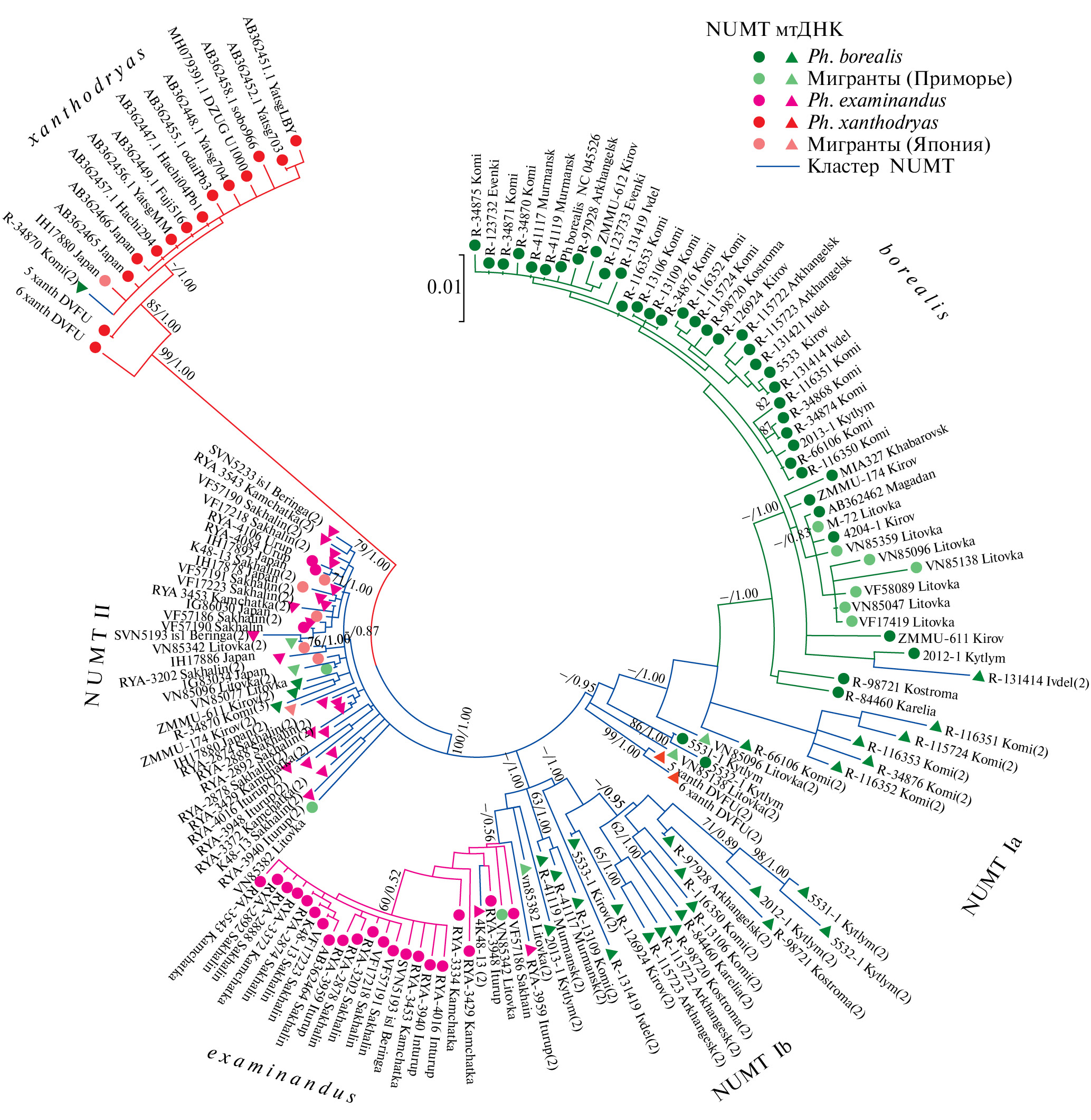 Для построения реконструкции связей мт-гаплотипов и их ядерных копий использованы метод максимального правдоподобия (модель замен GTR+G+I, bic = 22168.443) и байесовский подход. На обеих реконструкциях представлены четыре кластера, три из которых были существенно дифференцированы и соответствовали митохондриальным гаплотипам borealis, examinandus и xanthodryas (рис. 4). Четвертый кластер оказался наиболее гетерогенным, мы называем его супер-кластером по причине большого количества объединенных в нем последовательностей. Он включил не только все ядерные копии мтДНК, но и митохондриальные гаплотипы examinandus, которые обособились отдельной филогруппой. Условно супер-кластер разделился на три кластера, два из которых (NUMT Ia и NUMT Ib) соответствовали западной линии NUMT I и третий – восточной NUMT II. Часть NUMT отдельными длинными ветвями заняла промежуточное положение между митохондриальным и NUMT I кластерами.