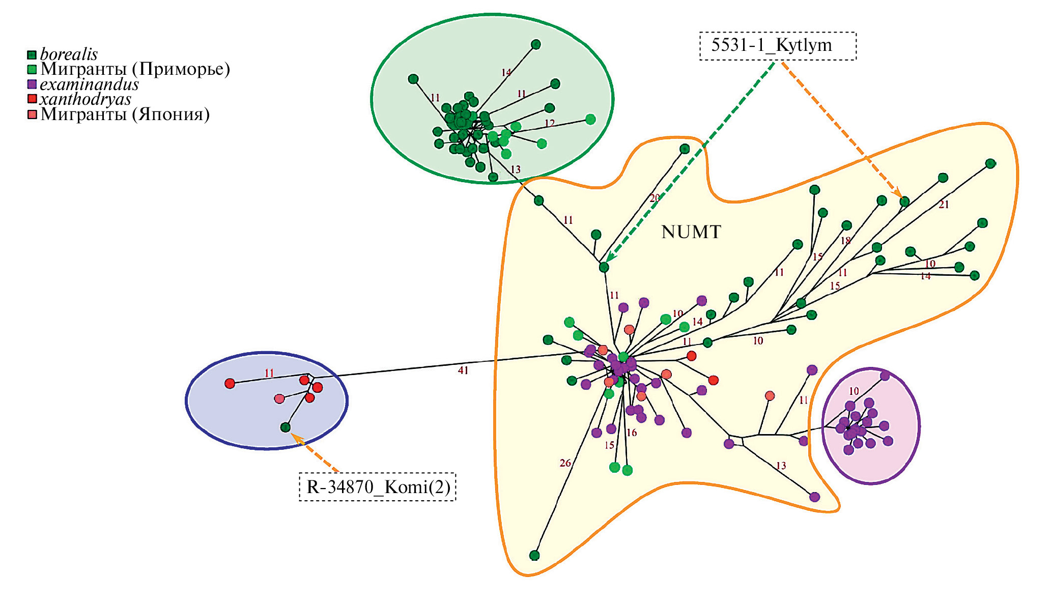 Интересным явился факт присутствия в кластере xanthodryas одной из ядерных копий, принадлежащей особи borealis из западной части ареала (Респ. Коми, R-34870). В свою очередь, ядерные копии мтДНК двух xanthodryas (5-xanth, 6-xanth) сгруппировались в кластере NUMT I с мигрирующим borealis (VN85138) из Приморья, митохондриальный гаплотип которого сходен с магаданским гаплотипом из Генбанка (AB362462). Такое перекрестное расположение мт-гаплотипов и ядерных копий косвенно указывает на произошедший обмен между ядерным и митохондриальным геномами. Несмотря на обособленность каждого митохондриального кластера, базовым для всех форм оказался суперкластер с ядерными копиями мтДНК.