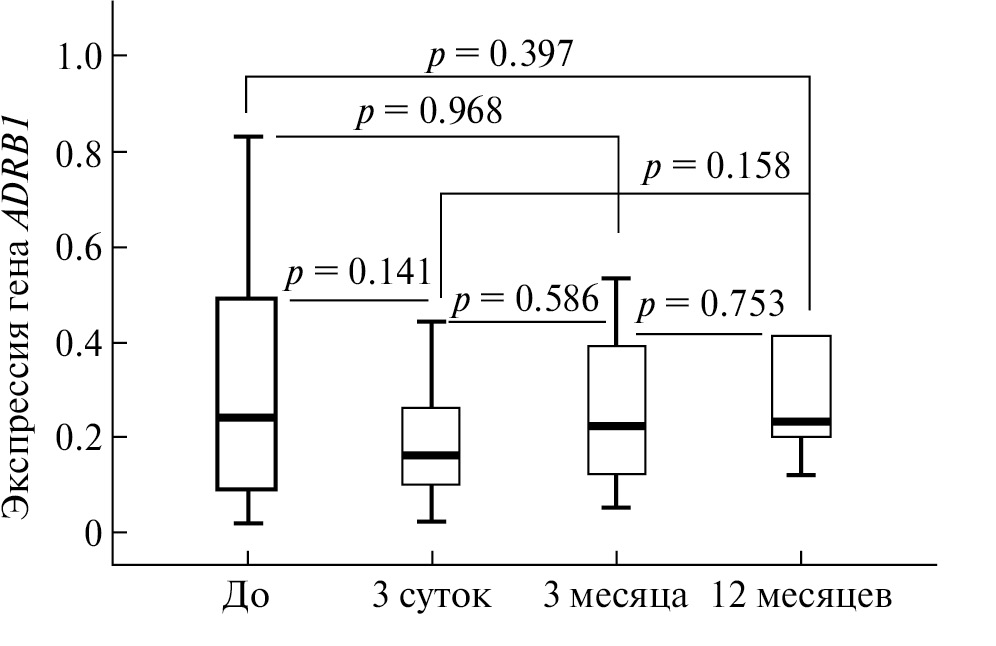 Рис. 1. Относительная экспрессия гена ADRB1 до и на разных сроках после аблации у пациентов с фибрилляцией предсердий.