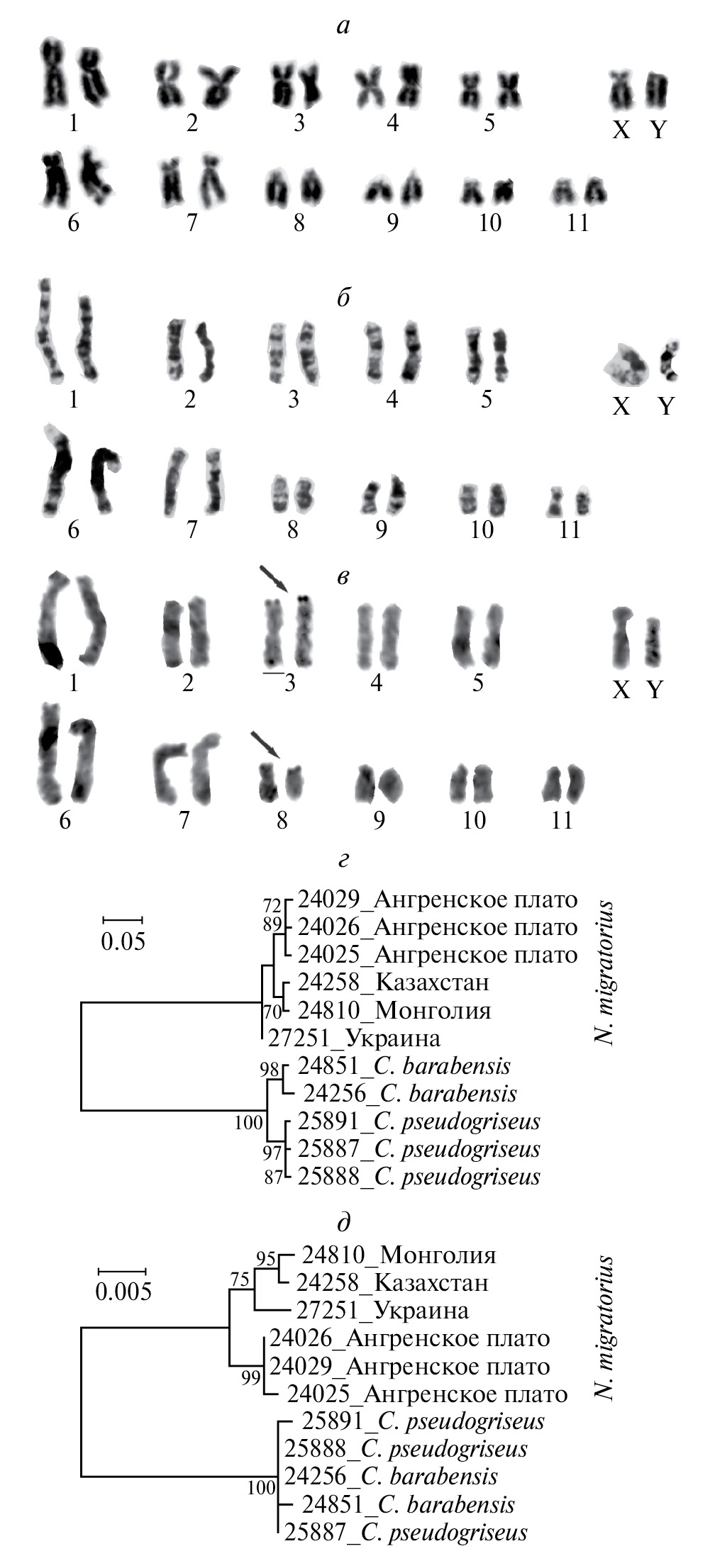 Рис. 1. Кариотип самца серого хомячка N. migratorius 2n = 24. а – рутинная окраска, б – G-окраска, в – Ag-NOR-окраска. Стрелками указано положение ЯОР, подчеркнута хромосома с ЯОР на обоих плечах. Кладограммы объединенных нуклеотидных последовательностей хомячков по результатам анализа ML: г – мтДНК (cytb и COI), д – яДНК (BGN и C-myc). Цифры в наименовании ветвей соответствуют регистрационным номерам образцов в КТЖ ИБР. Цифрами у узлов обозначены индексы бутстрэп-поддержки.
