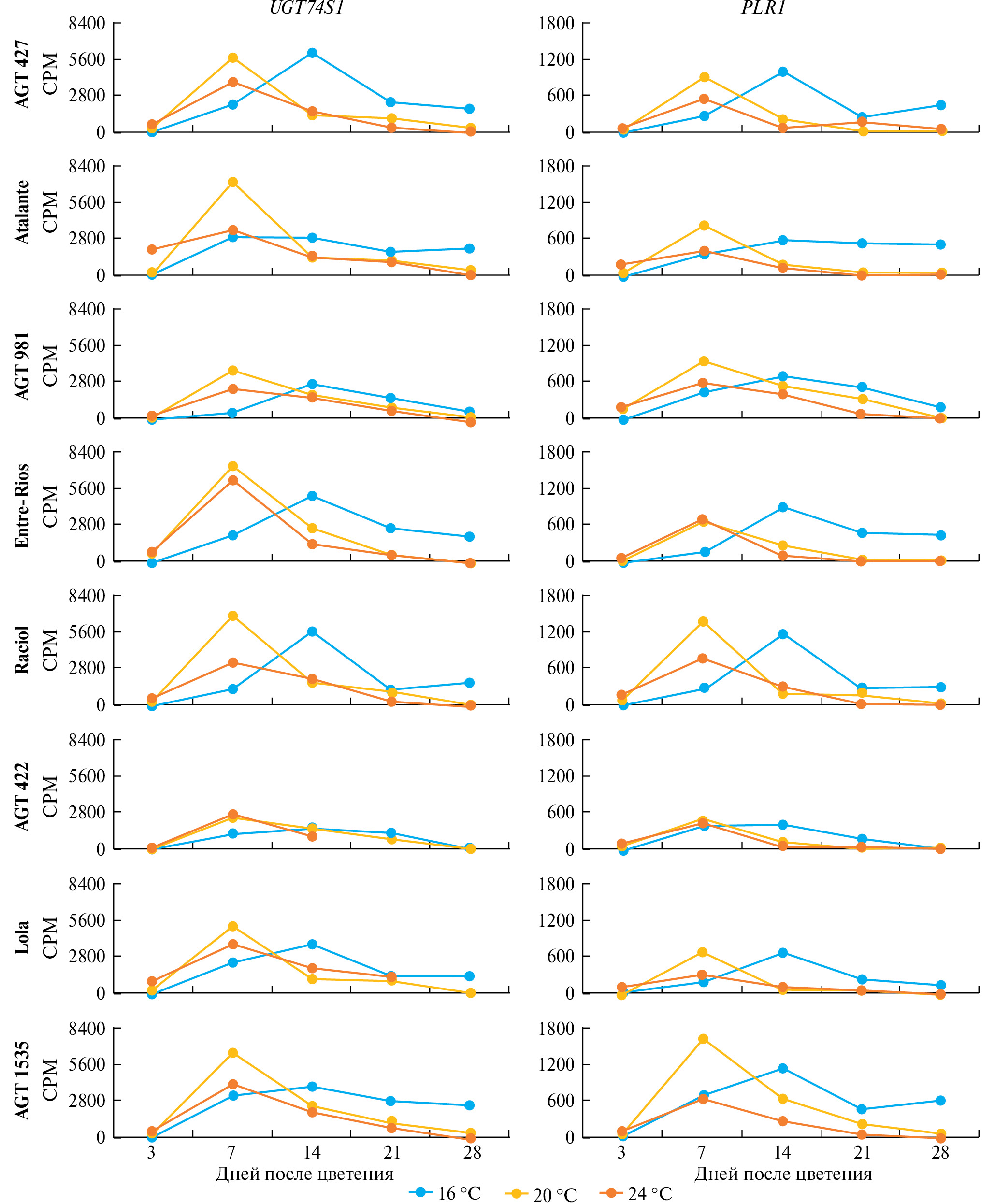 Экспрессия изучаемых генов в целом изменялась сходным образом для разных сортов/линий при развитии семян в одних и тех же условиях. На 3 ДПЦ уровень экспрессии UGT74S1 и PLR1 был низким для всех генотипов в трех условиях выращивания. Для всех исследованных сортов/линий наиболее высокого уровня экспрессия изучаемых генов достигала на 7 ДПЦ в условиях 20 и 24 °С. Затем на 14 ДПЦ в условиях 20 и 24 °С происходило снижение уровня экспрессии, которое продолжалось при дальнейшем развитии семян. В условиях 16 °С уровень экспрессии генов начинал повышаться на 7 ДПЦ и достигал максимального значения на 14 ДПЦ в большинстве сортов/линий (исключение – Atalante для гена UGT74S1, для которого уровень экспрессии был близким на 7 и 14 ДПЦ). На 21 и 28 ДПЦ в условиях 16 °С наблюдалось снижение экспрессии обоих генов, однако имелись различия между генотипами – у одних сортов/линий уровень экспрессии достигал минимума на 28 ДПЦ, а у других все еще оставался достаточно высоким на этой стадии развития.