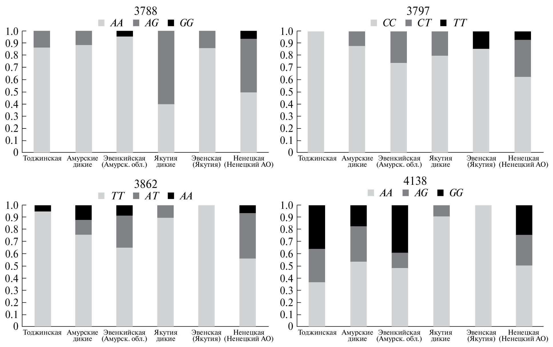 Анализ главных компонент (рис. 2) показывает, что ненецкая порода оленей и тоджинский экотип отличаются от остальных выборок по полиморфизмам в сайтах 3788 и 3797 (коэф. корреляции r(C) = −0,91, p = 0.012), у ненецкой породы в данных позициях доли минорного аллеля превышают 0.2, в то время как у тоджинских оленей минорный вариант T в позиции 3797 отсутствует. По второй главной компоненте, объясняющей 41.3% дисперсии, обосабливаются от остальных домашние эвенские и дикие олени из Якутии. Их объединяет отсутствие минорных гомозигот и низкая частота минорного аллеля в позициях 3862 (r(A) = 0.83, p = 0.044) и 4138 (r(A) = −0.92, p = 0.008).