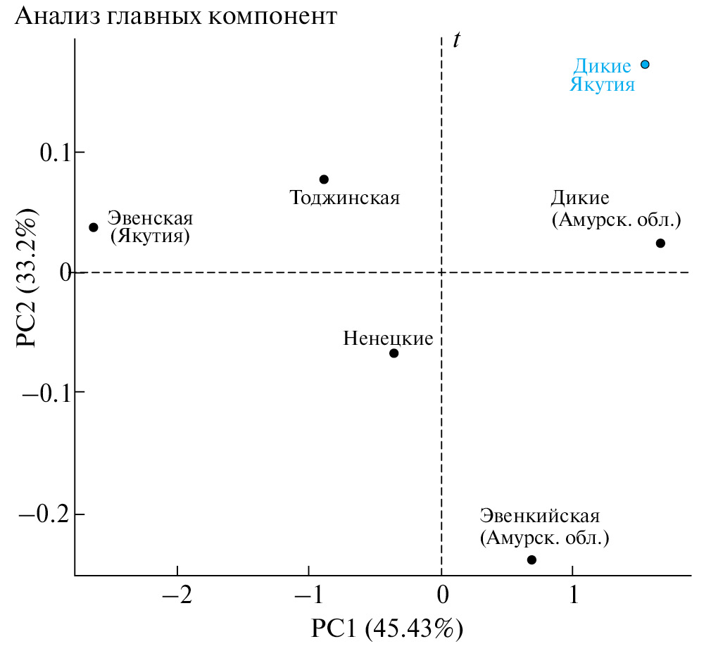 Рис. 3. Результаты анализа главных компонент на основании частот аллелей микросателлитных локусов гена андрогенового рецептора AR для изученных выборок северного оленя.