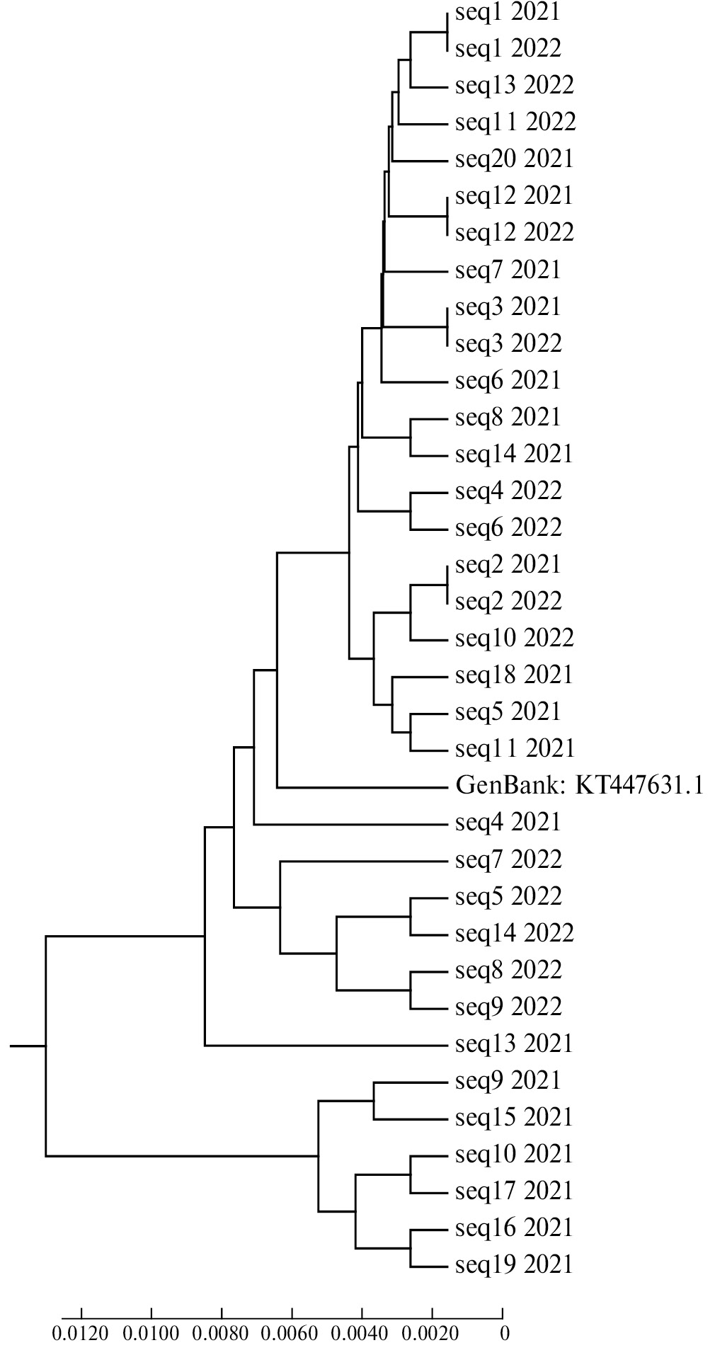 В исследованных нами 14 выборках Rh. padi из различных регионов России доля нуклеотидных замен во фрагменте митохондриального гена ND4 длиной 438 пн варьировала от 0.2 до 4.3%. Идентифицировали 30 митохондриальных гаплотипов (20 – в семи выборках, собранных в 2021 г., и 14 гаплотипов в 2022 г.), среди них четыре варианта были найдены в 2021 и 2022 гг.