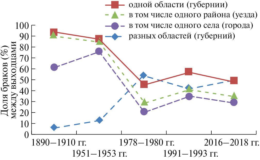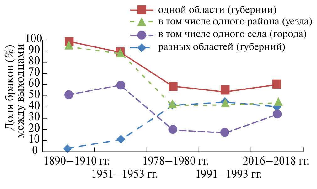 Во-вторых, с конца ХIХ до начала ХХI в. значительно уменьшилась доля браков, заключаемых между уроженцами одной губернии (области) (в 1.6 раза), одного уезда (района) (в 2 раза) и одного села (в 2.2 раза), тогда как удельный вес браков, заключаемых между выходцами разных областей, возрос в 10.6 раза (рис. 2). Установлена сильная прямая корреляционная связь между долями изолокальных браков (r = 1.00, p < 0.05), удельный вес которых отрицательно коррелировал с долей гетеролокальных браков (r = −1.00, p < 0.05).