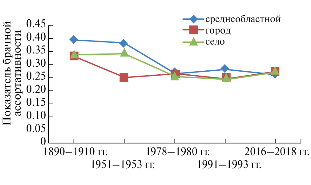 Среди населения юга Центральной России за 130-летний период положительная брачная ассортативность по месту рождения супругов снизилась в 1.5 раза (с 0.394 до 0.264) без существенных различий в уровне и динамике между городским и сельским населением (за исключением периода 1951–1953 гг., когда показатель брачной ассортативности в городе был в 1.4 раза выше, чем в селе) (K = 0.252).