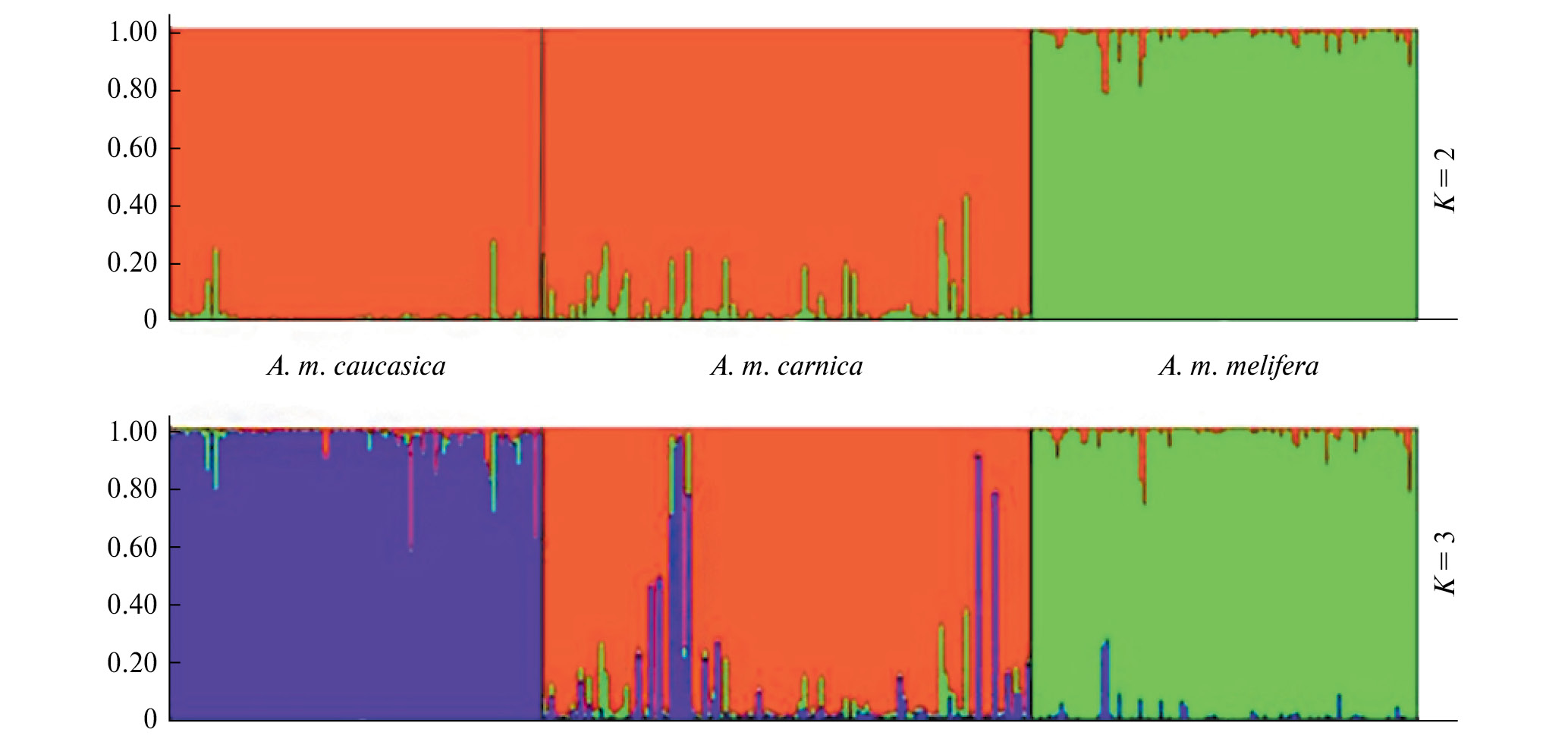 На первом этапе работы мы выполнили анализ полиморфизма девяти микросателлитных локусов (Ap243, 4a110, A24, A8, A113, A88, Ap049, A28 и A43) в выборках A. m. caucasica, A. m. carnica и A. m. mellifera. На рис. 1 представлены результаты кластерного анализа исследуемых выборок. DeltaK, используемая для расчета оптимального числа кластеров, достигла пиков при K = 2 (deltaK = 1479.4) и при К = 3 (deltaK = 276.6). При К = 2 выборки A. m. caucasica и A. m. carnica вошли в один кластер. Дифференциация трех подвидов наблюдалась при К = 3. Стандартное генетическое расстояние Nei между A. m. caucasica и A. m. carnica составило 0.269. В работе S. Nikolova с соавт. генетическое расстояние Nei между этими двумя подвидами составило 0.384 на основе анализа полиморфизма девяти микросателлитных локусов [14].