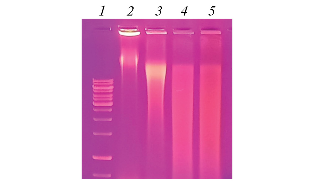 Рис. 4. Результаты гель-электрофореза генетического материала нематоды C. elegans, подвергнутой воздействию фурацилина в концентрации 0,00025 и АЦЦ в концентрациях 0,01 и 0,001 моль/л: 1 – маркер, 2 – вода (контроль), 3 – фурацилин 0,00025 + АЦЦ 0,01, 4 – фурацилин 0,00025 + АЦЦ 0,001, 5 – фурацилин 0,00025 моль/л.