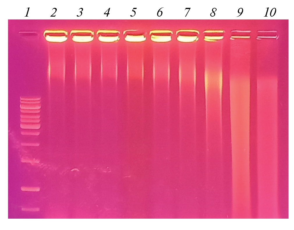 Рис. 3. Результаты гель-электрофореза генетического материала нематоды С. elegans, подвергнутой воздействию фурацилина в разных концентрациях (моль/л): 1 – маркер, 2 – вода (контроль), 3 – 0,000005, 4 – 0,00001, 5 – 0,00002, 6 – 0,00005, 7 – 0,0001, 8 – 0,00025; положительные контроли: 9 – БПЛ 0,015 моль/л и 10 – перекись водорода 0,1 моль/л.
