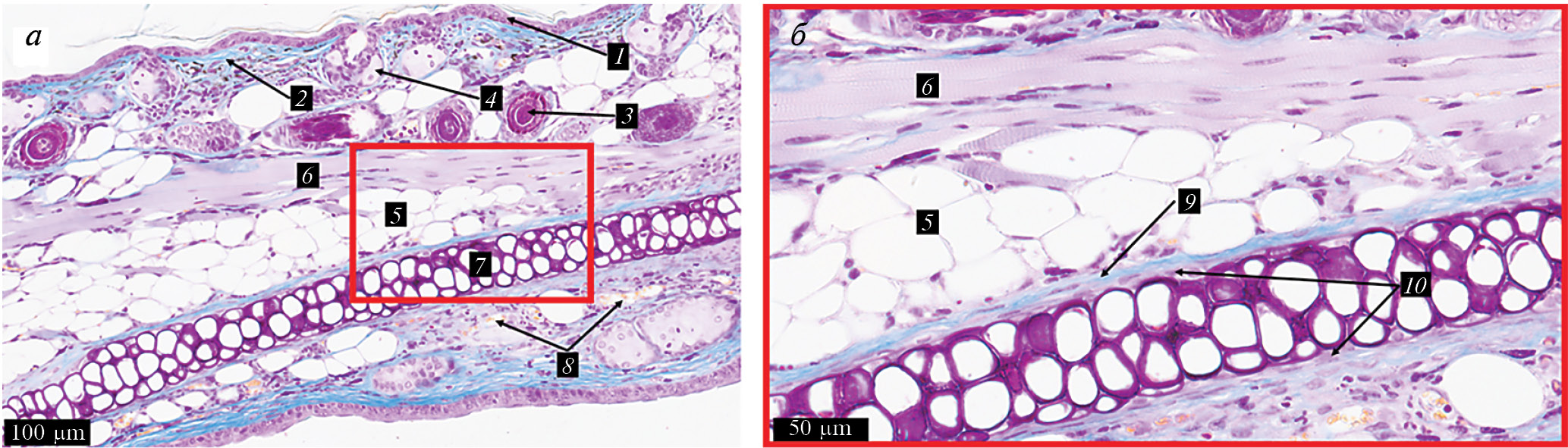 Рис. 1. Ушная раковина Acomys. 1 – эпидермис, 2 – дерма, 3 – волосяной фолликул, 4 – сальные железы, 5 – белые адипоциты, 6 – поперечно-полосатые скелетные миоциты, 7 – эластический хрящ, 8 – кровеносный сосуд, 9 – фиброзный слой надхрящницы, 10 – хондрогенный слой надхрящницы. Окраска по Маллори. Ув. х200 (а), х500 (б).