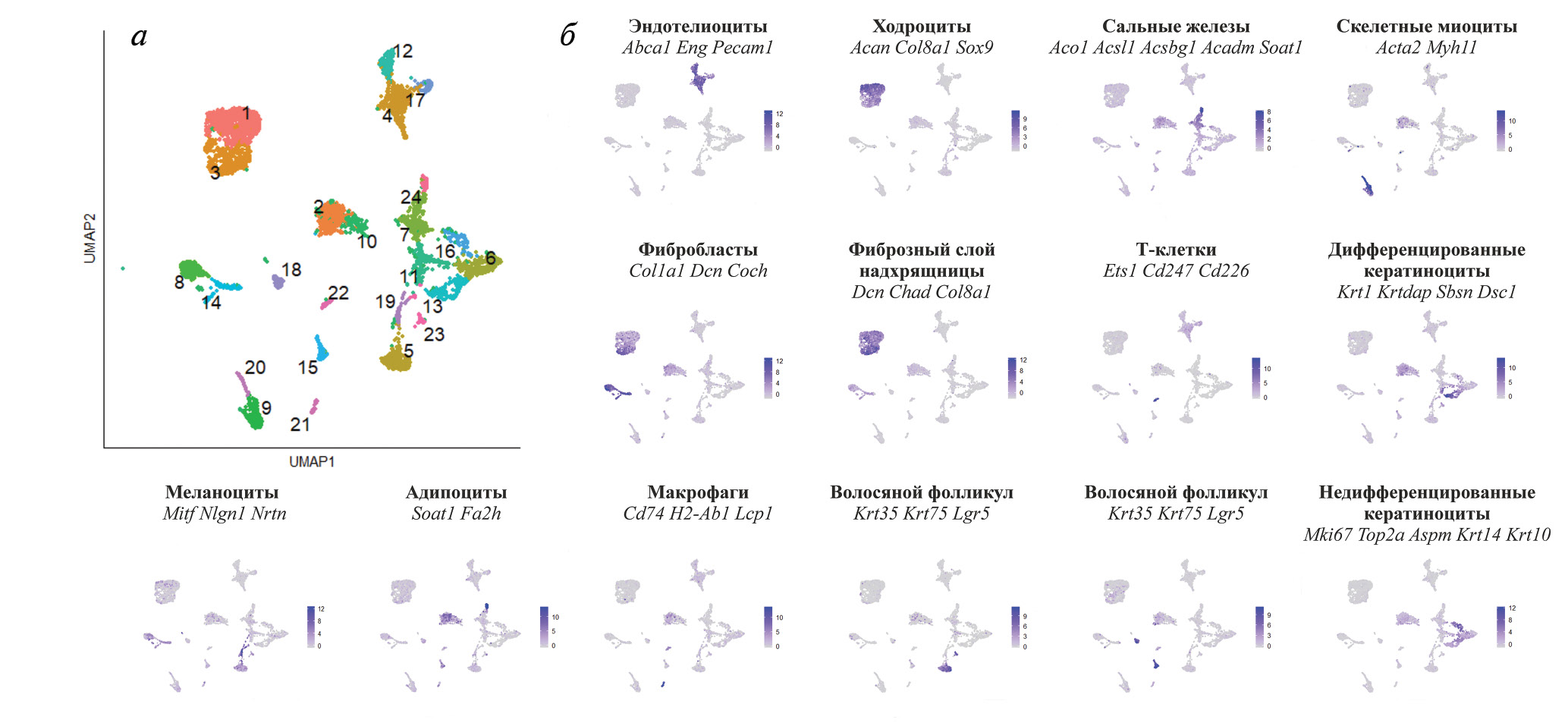 Рис. 2. Кластеризация и аннотация клеточных типов по данным scRNA-Seq. а – кластерограмма (кластеры 1–24) клеток ушной раковины Acomys cahirinus, построенная методом UMAP (Uniform Manifold Approximationand Projection); б – визуализация усредненной экспрессии ряда маркерных генов, характерных для различных клеточных типов.