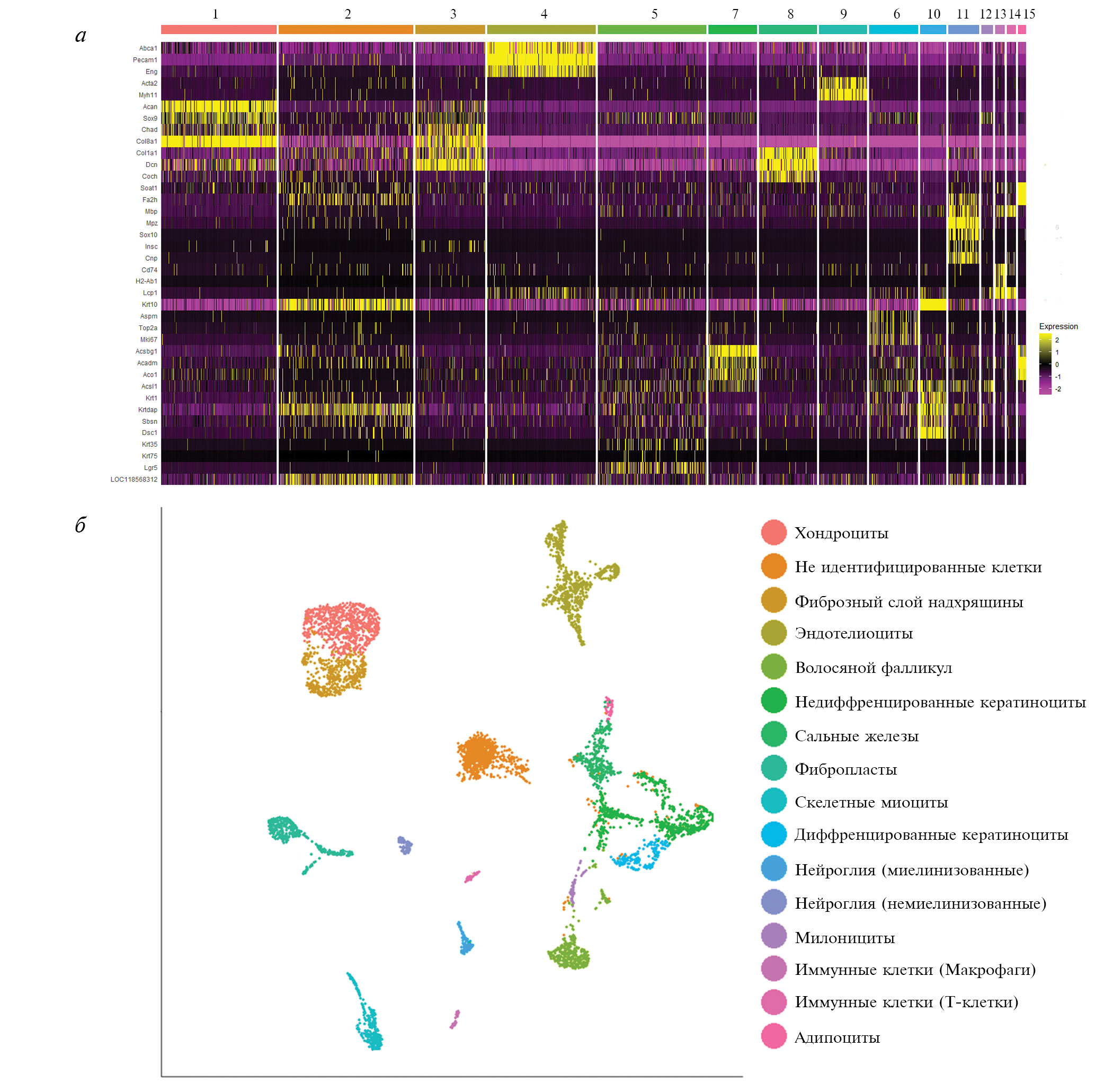 Рис. 3. Экспрессия маркерных генов и финальная аннотация клеточных типов. а – тепловая карта, демонстрирующая наиболее специфично экспрессируемые гены в каждом кластере клеток (1–15); б – кластерограмма клеток ушной раковины Acomys cahirinus с аннотацией клеточных типов, построенная методом UMAP.