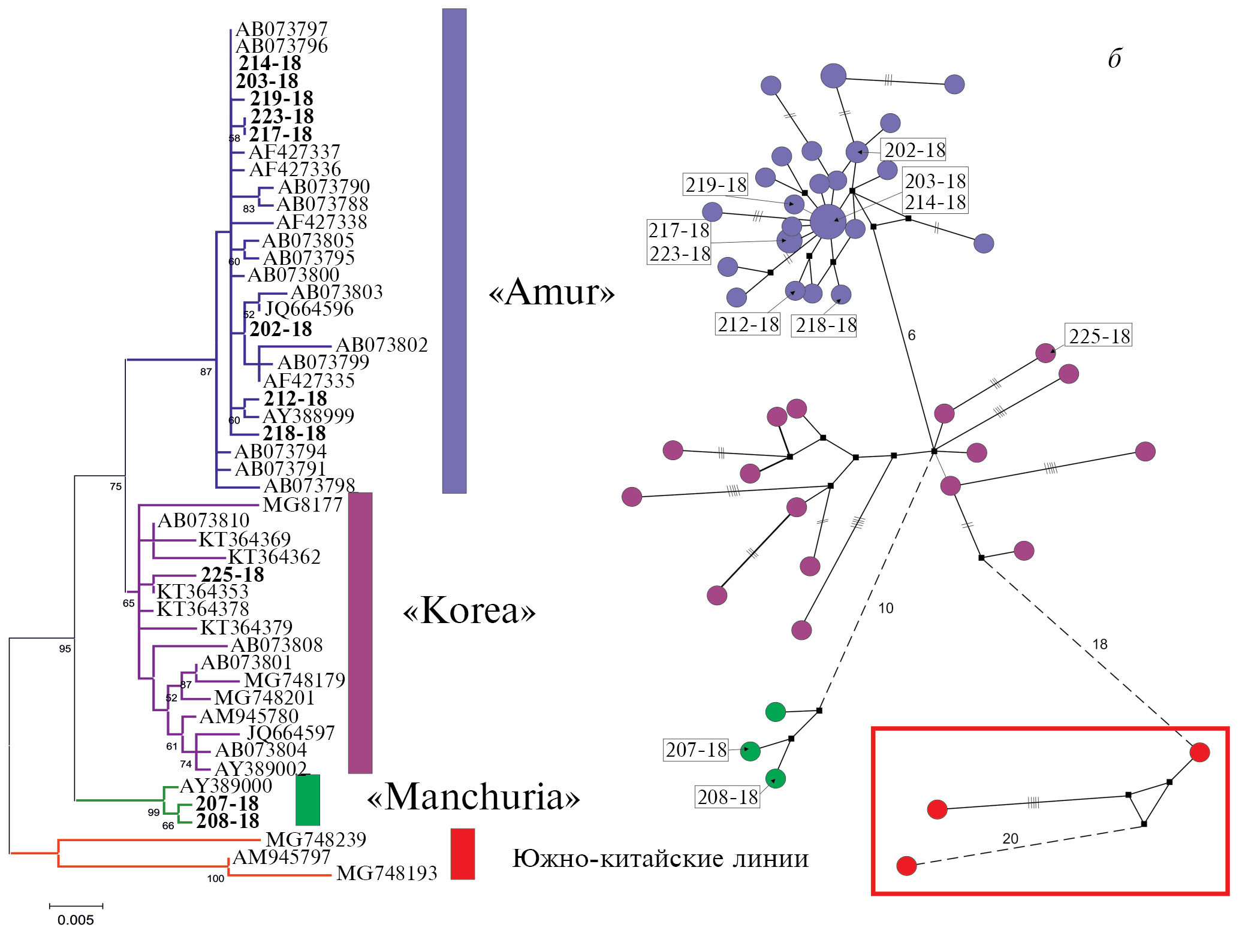 Все новые последовательности на ML-дендрограмме были распределены на три клады, которые соответствуют линиям “Amur”, “Korea” и “Manchuria” (рис. 1, а). Линии “Amur” и “Korea” на дереве сестринские, а линия “Manchuria” расположена базальнее, что указывает на ее большую древность. Большая часть последовательностей (72.73%) попала в кладу “Amur”, одна последовательность (9.09%) – в кладу “Korea”. Стоит отметить, что частота встречаемости особей с гаплотипами “Korea” на самом юге Приморского края в Хасанском районе несколько выше и составляет 38.46% [6]. Два гаплотипа 207-18 и 208-18 сгруппировались вместе с гаплотипом, обнаруженным ранее у особи из провинции Хэйлунцзян северо-востока Китая [2], сформировав кладу “Manchuria”.