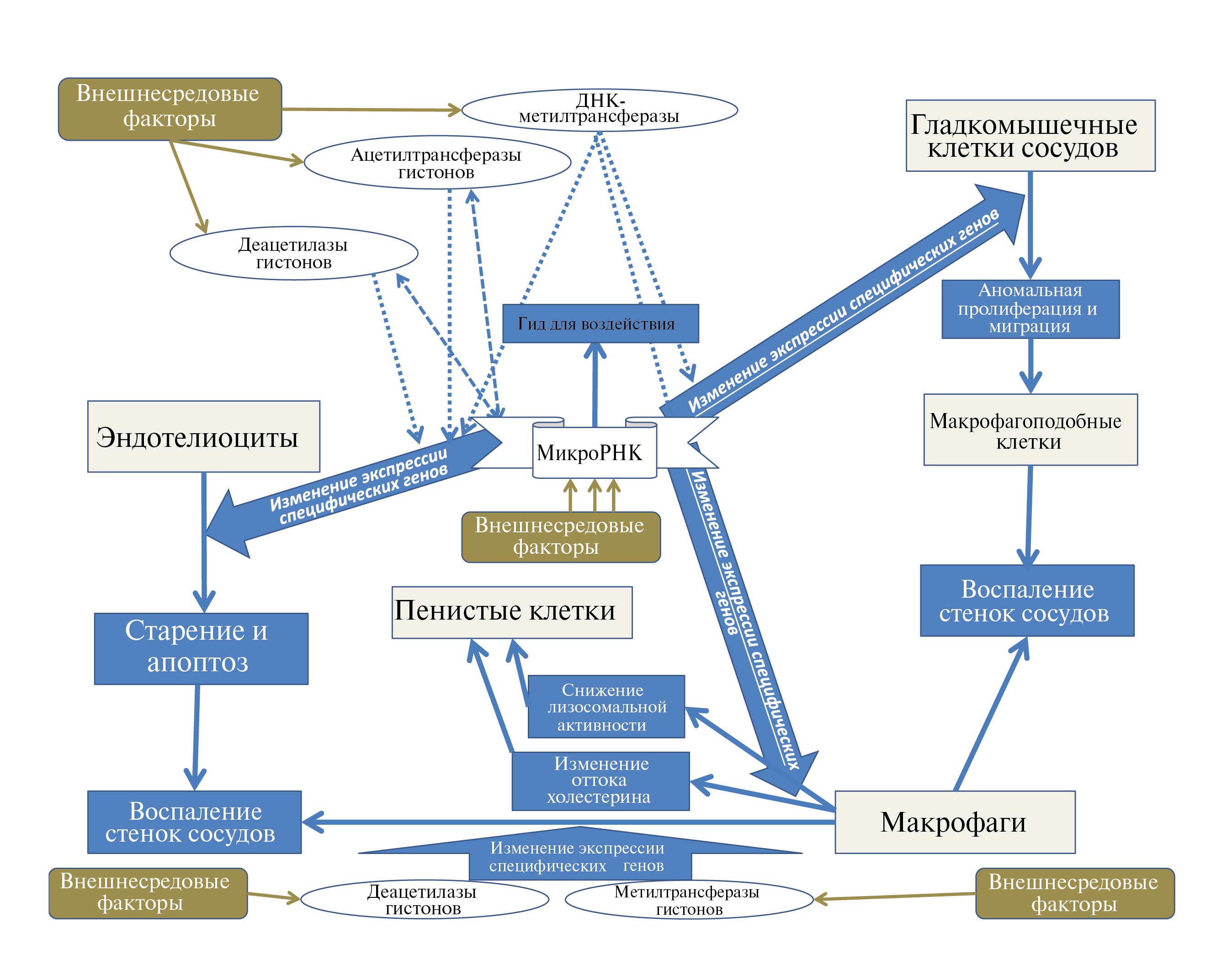 Проведенный в 2018 г. систематический обзор научной литературы показал, что микроРНК способны контролировать воспаление сосудистой стенки, регулируя ее инфильтрацию активированными лейкоцитами. К ним относятся miR-19a, miR-19b, miR-21. Ключевой микроРНК в данных механизмах АС является miR-126, которая ингибирует VCAM-1 (vascular cell adhesion molecule 1) и провоспалительный TNF-α. В связи с этим снижение экспрессии miR-126 повышает активность NF-κB, усиливая взаимодействие лейкоцитов с ЭЦ и способствуя АС [15]. На функцию макрофагов при АС оказывает влияние miR-33, которая регулирует зависимый от ABCA1 (АТФ-связывающий кассетный транспортер А1) отток холестерина. Также miR-33 ингибирует гены TFEB и FOXO3, снижая лизосомальную активность и фагоцитоз макрофагов. Поэтому воздействие анти-miR-33 повышает эффероцитоз, лизосомальный биогенез и деградацию апоптического материала макрофагов [19]. Изменение эпигенетической регуляции играет важную роль в поляризации макрофагов в М1-подобные (под влиянием деацетилаз гистонов HDAC3, HDAC7, HDAC9, модификаций гистонов H3K9me3, H3K36me3), что способствует воспалению сосудистой стенки [20]. Воспалительные макрофаги секретируют везикулы, содержащие специфические микроРНК (такие как miR-28, miR-146a, miR-185, miR-365, miR-503), которые используются для коммуникации между клетками атеросклеротических сосудов [15].