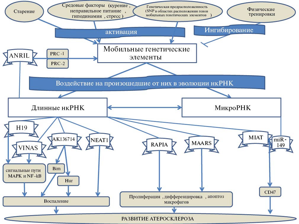 Длинные нкРНК относятся к эпигенетическим факторам, и изменения их уровней в патогенезе АС могут быть отражением особенностей экспрессии МГЭ, являющихся источниками нкРНК в эволюции [62]. Это обусловлено высокой чувствительностью РЭ к влиянию средовых воздействий [68] и гиперактивацией МГЭ при старении [22]. Продукты экспрессии HERV [69] и LINE-1 [70] сами функционируют в качестве длинных нкРНК. Описана роль взаимодействий РЭ с длинными нкРНК в патогенезе АС. Alu-элементы (относятся к неавтономным РЭ) связываются с длинной нкРНК ANRIL, вовлеченной в развитие AC [71]. ANRIL взаимодействует непосредственно с последовательностями Alu в геноме [72], которые оказывают проатерогенный эффект, располагаясь в областях промоторов генов-мишеней [73], кодирующих белки группы поликомб PRC-1 и PRC-2. Данные белки рекрутируются с помощью ANRIL и используются для модификации эпигенетических факторов с ингибированием генной экспрессии в цис-регуляции апоптоза, пролиферации и адгезии клеток, воспаления и развития АС [72].