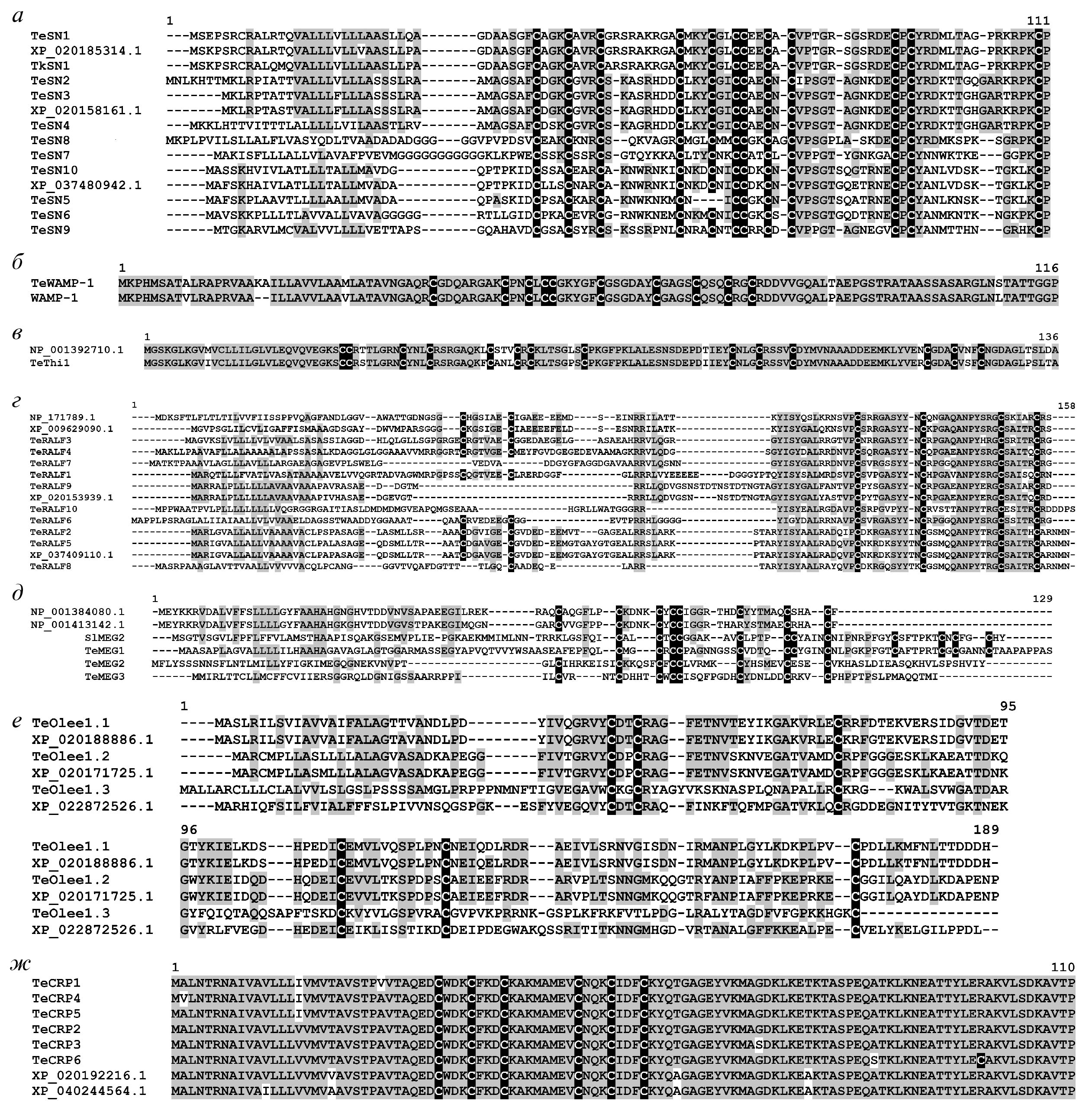Рис. 2. Выравнивание аминокислотных последовательностей предшественников: а − снакинов Th. elongatum, TkSN1 пшеницы [28] и некоторых снакинов растений рода Triticum; б − гевеиноподобного пептида Th. elongatum и пептида WAMP-1 пшеницы (P85966.2); в − тиониноподобного пептида Th. elongatum и гомологичной последовательности T. aestivum; г − пептидов семейства RALF Th. elongatum и других растений; д − пептидов семейства MEG Th. elongatum, пептида MEG2 Solanum lycopersicum [15] и пептидов MEG1 (NP_001384080.1), MEG2-like (NP_001413142.1) Zea mays; е − пептидов семейства Ole e 1 Th. elongatum, Ole e 1-like пептида Olea europaea var. sylvestris (XP_022872526.1) и гомологичных последовательностей; ж − цистеин-богатых пептидов Th. elongatum с новым мотивом и их ближайших гомологов. Консервативные аминокислотные остатки выделены серым цветом. Остатки цистеина в зрелом пептиде выделены белым цветом на черном фоне. Группы сходных пептидов разделены пустой строкой.