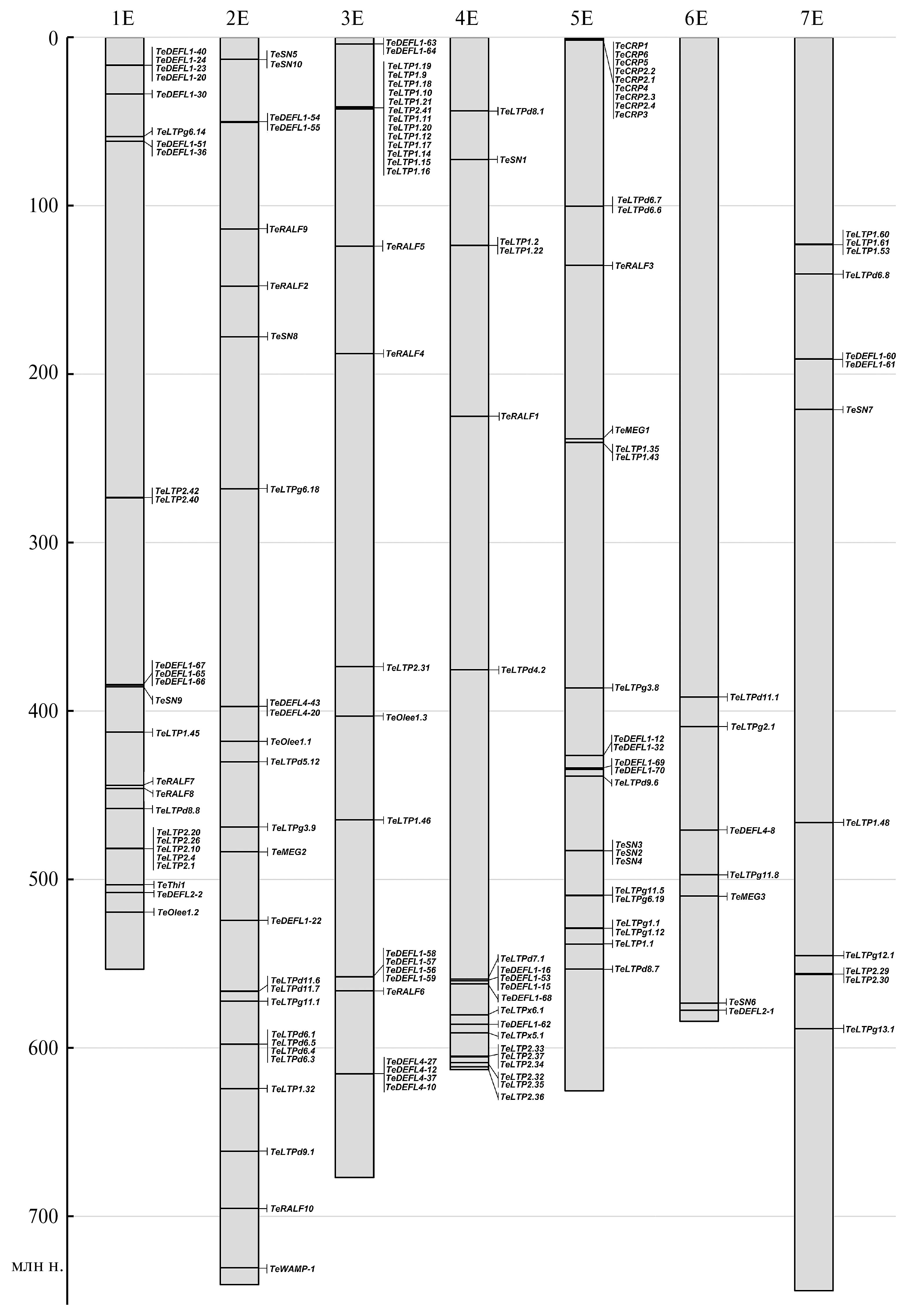 Интересно распределение по хромосомам пырея генов различных подсемейств пептидов (рис. 6). Так, гены “классических” дефензинов расположены на всех хромосомах, кроме 6Е. Гены дефензинов с 4-Цис-мотивом находятся только на трех хромосомах 2Е, 3Е и 6Е. Подавляющее число генов LTP 1 находится на хромосоме 3Е; гены LTP 2, за единичными исключениями, – на хромосомах 1Е и 4Е; гены LTP D – на хромосомах 2Е, 4Е, 5Е; гены типа LTP G – преимущественно на хромосоме 5Е. В ряде случаев гены пептидов одного семейства образуют кластеры, кодирующие сходные по последовательности пептиды, что свидетельствует о том, что они возникли в результате тандемных дупликаций (см. рис. 4). К таким кластерам относятся, например, кластер генов дефензинов, кодирующих TeDEFL1-20, -23, 24, -40, на хромосоме 1Е (см. рис. 1 и 4); кластер генов LTP 1 на хромосоме 3Е, кластер генов LTP D подтип 6 на хромосоме 2Е (см. рис. 3 и 4). Гены снакинов, кодирующие близкородственные пептиды TeSN2, 3 и 4, а также гены цистеин-богатых пептидов CRP с новым мотивом образуют отдельные кластеры на хромосоме 5Е (см. рис. 2 и 4).