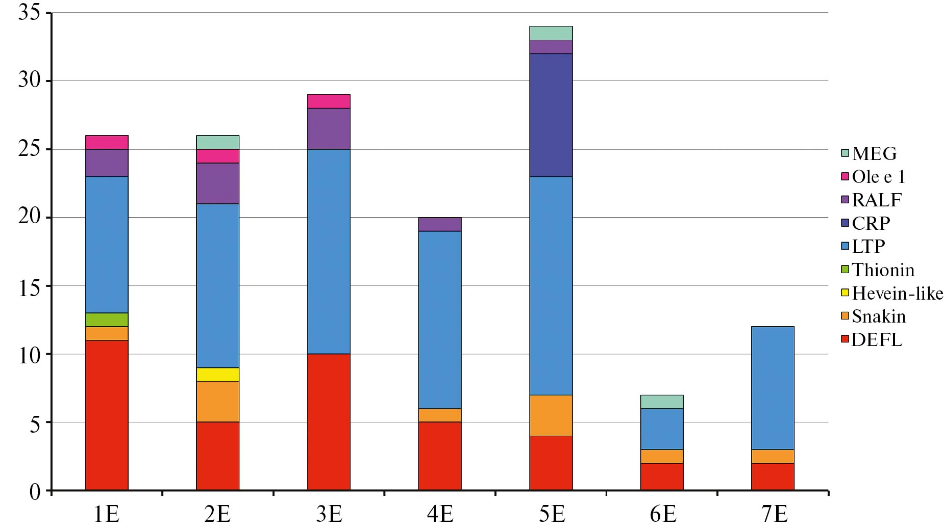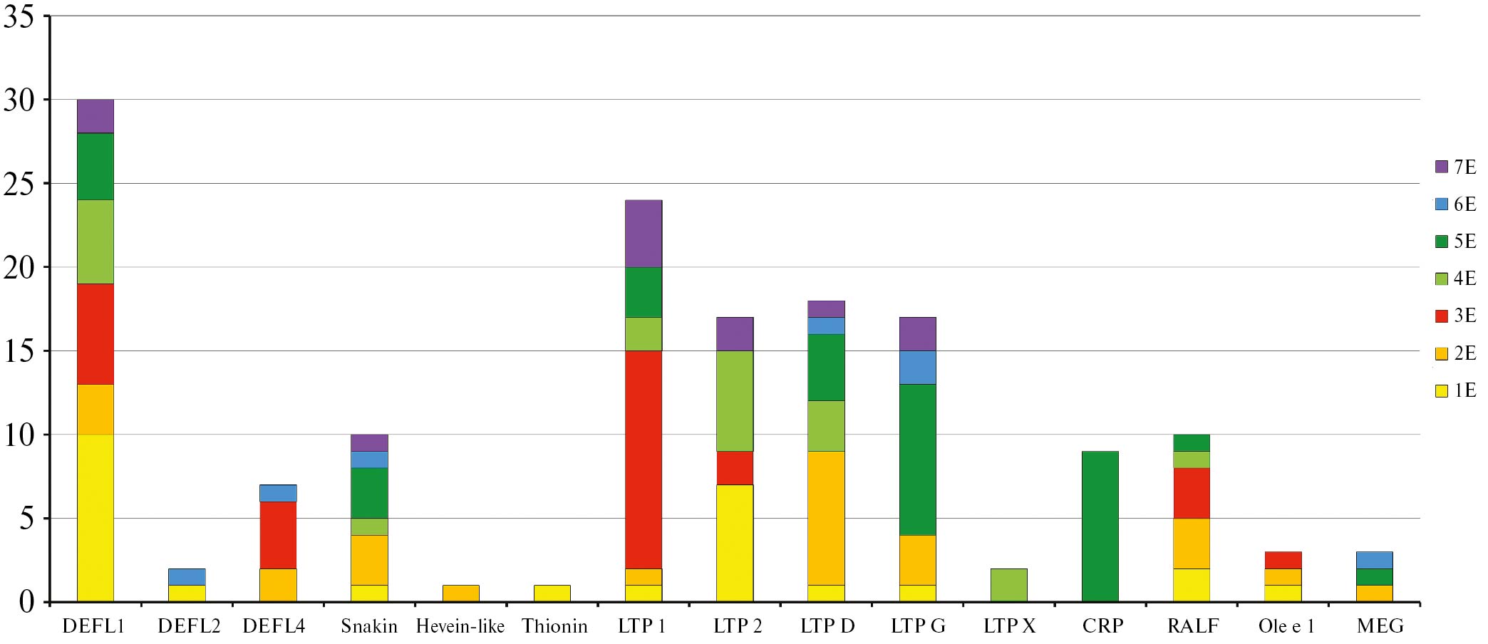 Самое многочисленное семейство генов пептидов у пырея представлено генами LTP (78). Следующим по численности семейством оказались дефензины (39). Эти данные согласуются с литературными данными о численном преобладании генов LTP и дефензинов в геномах растений [13, 53, 69, 70].