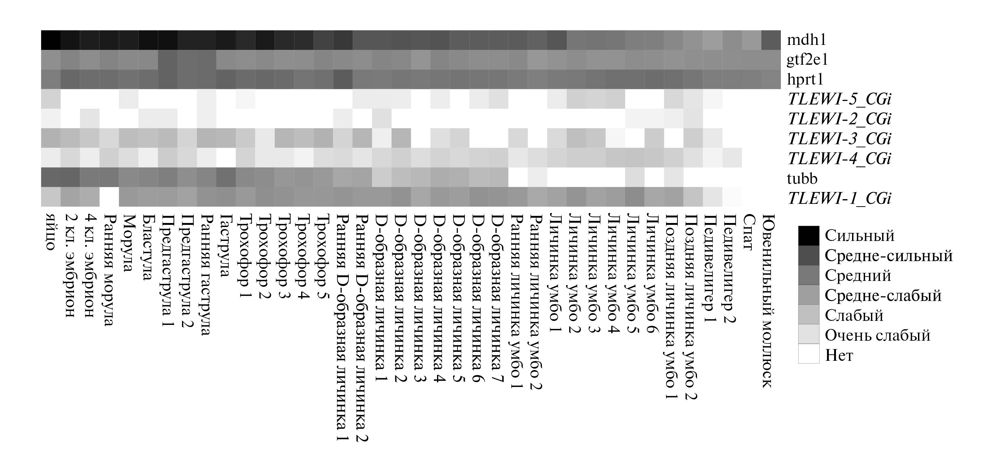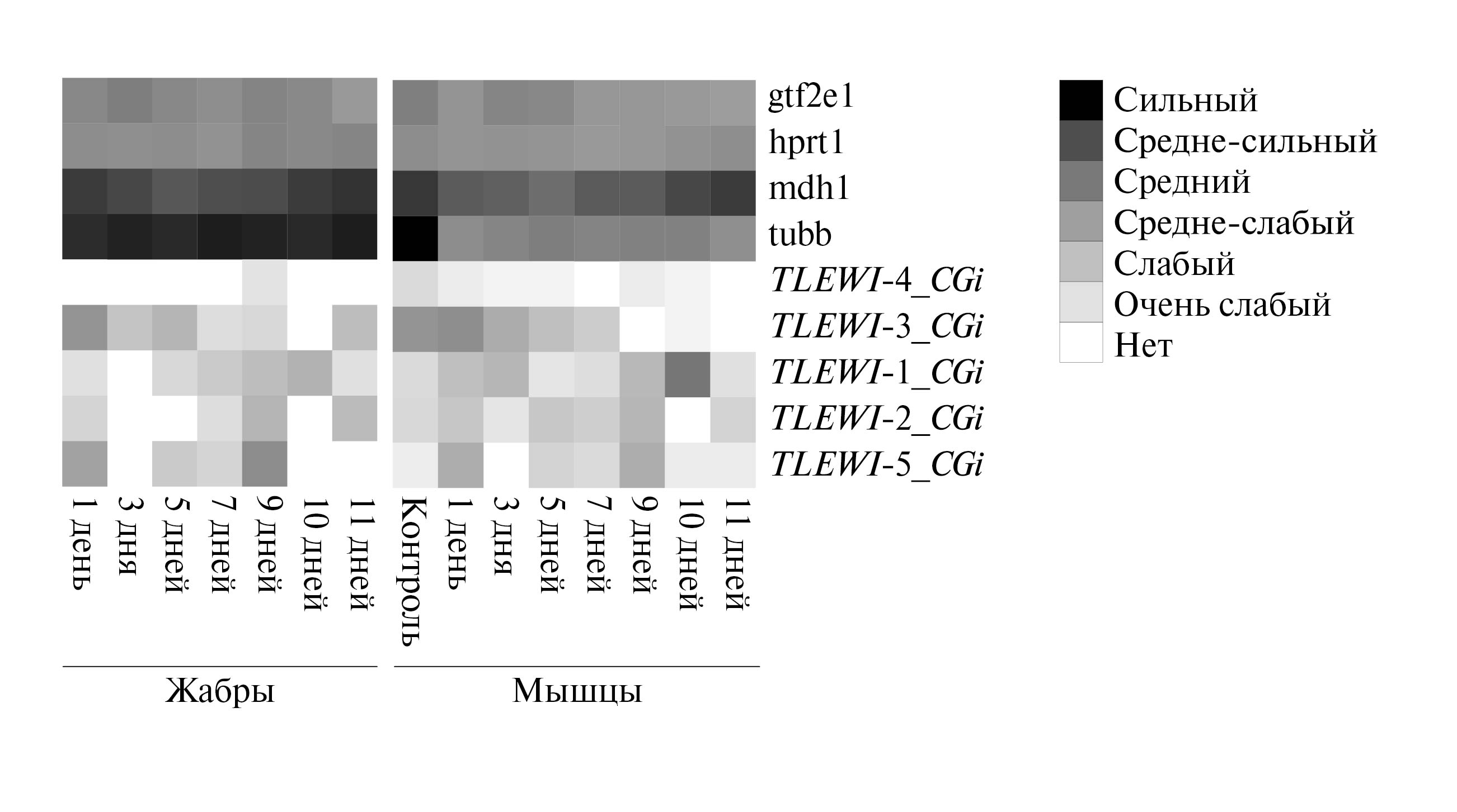 Из полученных результатов извлекались данные дифференциальной экспрессии генов пяти элементов TLEWI. Кроме того, в качестве контроля транскрипционной активности в образцах в анализ были взяты гены домашнего хозяйства mdh1 (кодирует цитоплазматическую малатдегидрогеназу), hprt1 (кодирует фермент гипоксантин-гуанинфосфорибозилтрансферазу), tubb (кодирует цитоскелетный белок тубулин) и gft2e1 (кодирует субъединицу общего фактора транскрипции IIE). Данные визуализировались в виде тепловых карт. SRA группировали в зависимости от факторов воздействия на образцы, стадий онтогенеза устрицы и типа тканей. По интенсивности окрашивания ячеек проводился сравнительный анализ уровня транскрипционной активности. Были введены семь визуально различимых категорий: отсутствие (нет), очень слабый (о/сл), слабый (сл), средне- слабый (ср/сл), средний (ср), средне-сильный (ср/сил) и сильный (сил). Для описания динамики экспрессии были введены следующие категории: с зависимостью от условий (СЗ – экспрессия гена присутствует практически во всех точках и наблюдается очевидная тенденция изменения уровня активности), постоянная без зависимости от условий (ПБЗ – экспрессия гена присутствует практически во всех точках, но нет очевидного изменения уровня активности) и мозаичная (М – экспрессия гена проявляется случайным образом).